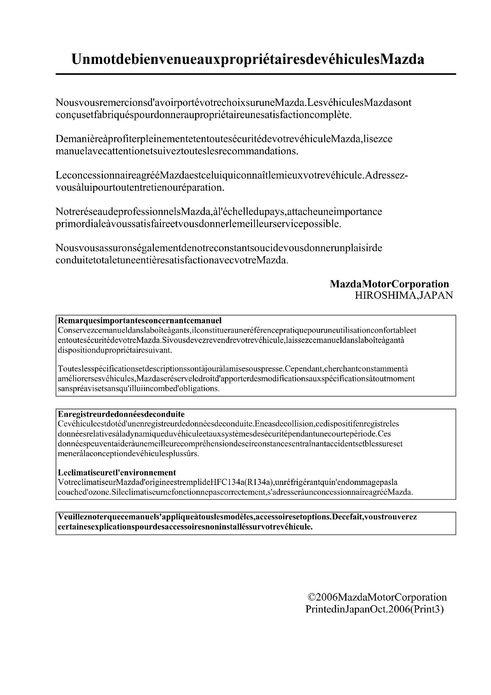 Black plate (1,1) Mazda3_8V65-EC-06F_Edition3 Page1 Wednesday, September 13 2006 4:24 PM Form No.8V65-EC-06FBlack plate (2,1) Mazda3_8V65-EC-06F_Edition3 Page2 Wednesday, September 13 2006 4:24 PM Form No.8V65-EC-06FBlack plate (3,1) Nous vous remercions d'avoir porté votre choix sur une Mazda. Les véhicules Mazda sont conçus et fabriqués pour donner au propriétaire une satisfaction complète. De manière à profiter pleinement et en toute sécurité de votre véhicule Mazda, lisez ce manuel avec attention et suivez toutes les recom mandations. Le concessionnaire agréé Mazda est celui qui connaît le mieux votre véhicule. Adressez- vous à lui pour tout entretien ou réparation. Notre réseau de professionnels Mazda, à l'échelle du pays, attache une importance primordiale à vous satisfaire et vous donner le meilleur service possible. Nous vous assurons également de notre constant souci de vous donner un plaisir de conduite total et une entière satisfaction avec votre Mazda. Mazda Motor Corporation HIROSHIMA, JAPAN Remarques importantes concernant ce manuel Conservez ce manuel dans la boîte à gants, il constituera une référence pratique pour une utilisation confortable et en toute sécurité de votre Mazda. Si vous devez revendre votre véhicule, laissez ce manuel dans la boîte à gant à disposition du propriétaire suivant. Toutes les spécifications et descriptions sont à jour à la mise sous presse. Cependant, cherchant constamment à améliorer ses véhicules, Mazda se réserve le droit d'apporter des modifications aux spécifications à tout moment sans préavis et sans qu'il lui incombe d'obligations. Enregistreur de données de conduite Ce véhicule est doté d'un enregistreur de données de conduite. En cas de collision, ce dispositif enregistre les données relatives à la dynamique du véhicule et aux systèmes de sécurité pendant une courte période. Ces données peuvent aider à une meilleure compréhension des circonstances entraînant accidents et blessures et mener à la conception de véhicules plus sûrs. Le climatiseur et l'environnement Votre climatiseur Mazda d'origine est rempli de HFC 134a (R134a), un réfrigérant qui n'endommage pas la couche d'ozone. Si le climatiseur ne fonctionne pas correctement, s'adresser à un concessionnaire agréé Mazda. Veuillez noter que ce manuel s'applique à tous les modèles, accessoires et options. De ce fait, vous trouverez certaines explications pour des accessoires non installés sur votre véhicule. ©2006 Mazda Motor Corporation Printed in Japan Oct. 2006(Print3) Un mot de bienvenue aux propriétaires de véhicules Mazda Mazda3_8V65-EC-06F_Edition3 Page3 Wednesday, September 13 2006 4:24 PM Form No.8V65-EC-06FBlack plate (4,1) Le désir de Mazda est que vous trouviez un plaisir maximum à conduire votre véhicule. La lecture intégrale de ce manuel y contribuera largement. Les illustrations complètent le texte pour vous donner la meilleure explication possible sur la manière d'utiliser votre Mazda. Toutes les caractéristiques, informations concernant la sécurité et les méthodes de conduite sous différentes conditions sont expliquées dans votre manuel. Le symbole ci-dessous, quand il apparaît dans ce manuel indique “ Ne faites pas ceci” ou “Evitez que ceci se produise”. Index: L'index vous indique toute l'information, par ordre alphabétique, contenue dans le manuel. Ce manuel comprend plusieurs avertissements sous des titres tels que: PRUDENCE, ATTENTION et REMARQUE. PRUDENCE Le titre PRUDENCE indique une situation où, si la PRUDENCE est ignorée, de graves blessures ou la mort peuvent en résulter. ATTENTION Le titre ATTENTION indique une situation où, si l'on ne fait pas attention cela risque d'entraîner des blessures corporelles et (ou) des dommages au véhicule. REMARQUE Une REMARQUE donne des informations et quelques fois indique comment faire une bonne utilisation du véhicule. Le symbole ci-dessous, situé sur certaines composantes du véhicule, indique que ce manuel contient de l'information concernant la composante en question. Se référe r au manuel pour une explication détaillée. Utilisation de ce manuel Mazda3_8V65-EC-06F_Edition3 Page4 Wednesday, September 13 2006 4:24 PM Form No.8V65-EC-06FBlack plate (5,1) Mazda3_8V65-EC-06F_Edition3 Page5 Wednesday, September 13 2006 4:24 PM Form No.8V65-EC-06F Table des matières Présentation de votre véhicule Vues de l'intérieur, de l'extérieur et identification des éléments de votre véhicule Mazda.
