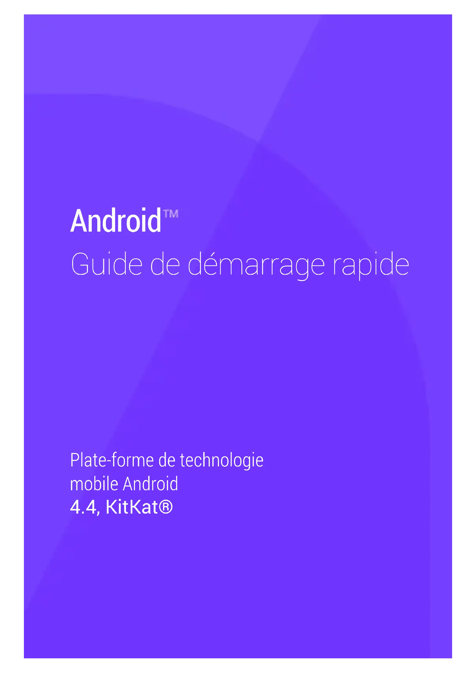 Guide de démarrage rapide Plate-forme de technologie mobile Android 4.4, KitKat®GUIDE DE DÉMARRAGE RAPIDE D'ANDROID ii Copyright © Google Inc. 2013. Tous droits réservés. Édition 1.10. Google, Android, Gmail, Google Maps, Chrome, Nexus, Google Play, YouTube, Google+ et les autres marques appartiennent à Google Inc. La liste des marques Google est disponible à l'adresse http://www.google. com/permissions/trademark/our-trademarks.html. Toutes les autres marques sont la propriété de leurs détenteurs respectifs. Ce guide présente le système d'exploitation Android 4.4 pour les appareils Nexus et édition Google Play. Certaines informations qu'il contient peuvent varier en fonction des produits ou des logiciels qui s'exécutent sur ceux- ci. Les informations contenues dans ce guide sont susceptibles d'être modiées sans préavis. Pour un fonctionnement optimal, assurez-vous que vous utilisez la dernière mise à jour du système Android. Pour connaître le numéro de version de votre appareil ou rechercher la dernière mise à jour du système, accédez à Paramètres > Système > À propos du téléphone ou À propos de la tablette, et recherchez la version d'Android ou les mises à jour du système. Si vous ne possédez pas de Nexus ni de téléphone édition Google Play et que vous utilisez Android 4.4 sur un autre appareil, certains détails du système décrits dans ce guide peuvent varier. Pour une aide et une assistance en ligne complètes, y compris des informations sur les appareils Nexus et édition Google Play exécutant le logiciel décrit dans le présent guide, ainsi que des liens vers des informations concernant d'autres appareils Android, consultez la page support.google.com/android.GUIDE DE DÉMARRAGE RAPIDE D'ANDROID iii Table des matières 1 Bienvenue sur Android 1 À propos d'Android 4.4 1 Congurer l'appareil 1 Découvrir votre écran d'accueil 3 Explorer l'appareil 4 Organiser vos écrans d'accueil 7 Appuyer et saisir du texte 9 Aide et assistance 10 Version et mises à jour d'Android 11 2 Fonctionnalités essentielles 12 Google Now 12 Dites à Google ce que vous voulez faire 16 Notications et paramètres 18 Écran de verrouillage 22 Android Beam 23 Paiement sans contact 24 Impression 25 Stockage de chiers 26 Gestionnaire d'appareils Android 28 Captures d'écran 28 3 Utiliser le clavier 30 Saisir et modier du texte 30 Saisie gestuelle 34 Dictionnaires du clavier 35 Saisie vocale 36GUIDE DE DÉMARRAGE RAPIDE D'ANDROID iv 4 Essayer quelques applications 37 Toutes les applications 37 Google Play 39 Téléphone 40 Gmail 41 Galerie 45 Photos 46 Contacts 48 Hangouts et SMS 49 Agenda 50 5 Paramètres 52 6 Accessibilité 55GUIDE DE DÉMARRAGE RAPIDE D'ANDROID BIENVENUE SUR ANDROID 1