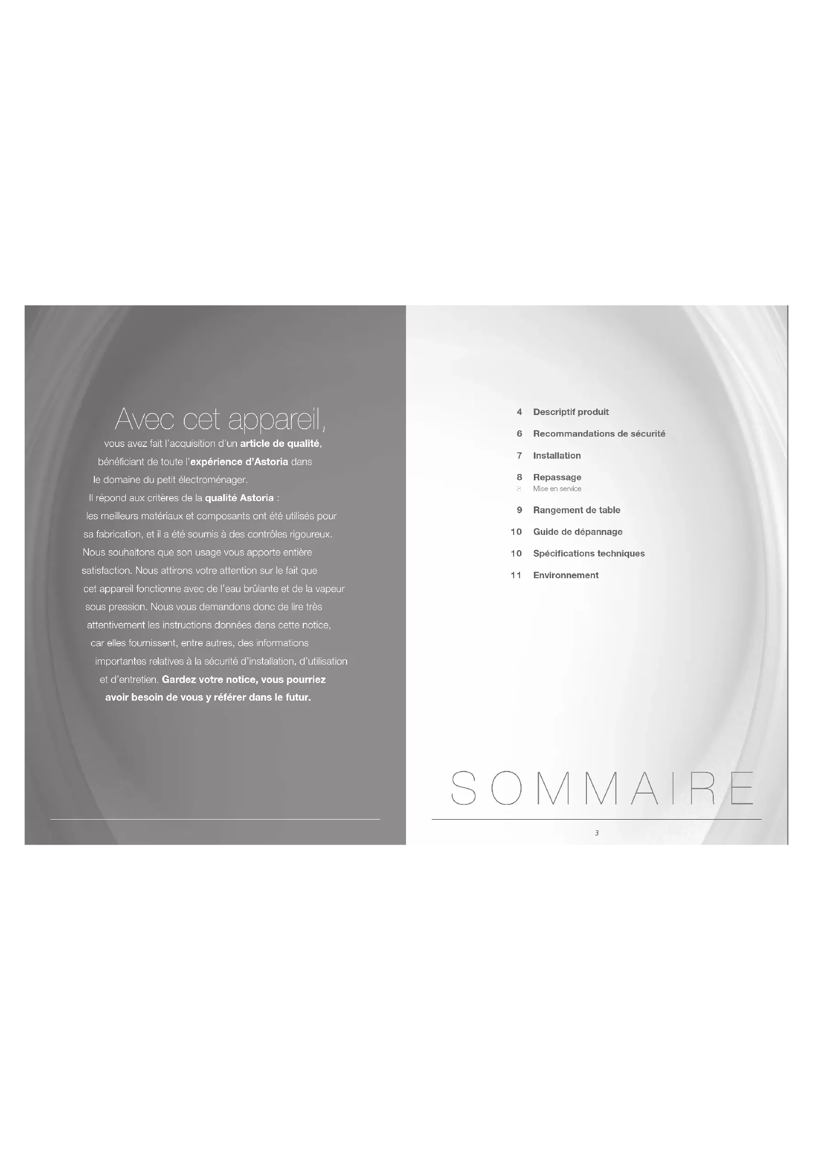 4 Descriptif produit 6 Recommandations de sécurité 7 Installation 8 Repassage Mise en service 9 Rangement de table 10 Guide de dépannage 10 Spécifications techniques 11 Environnement