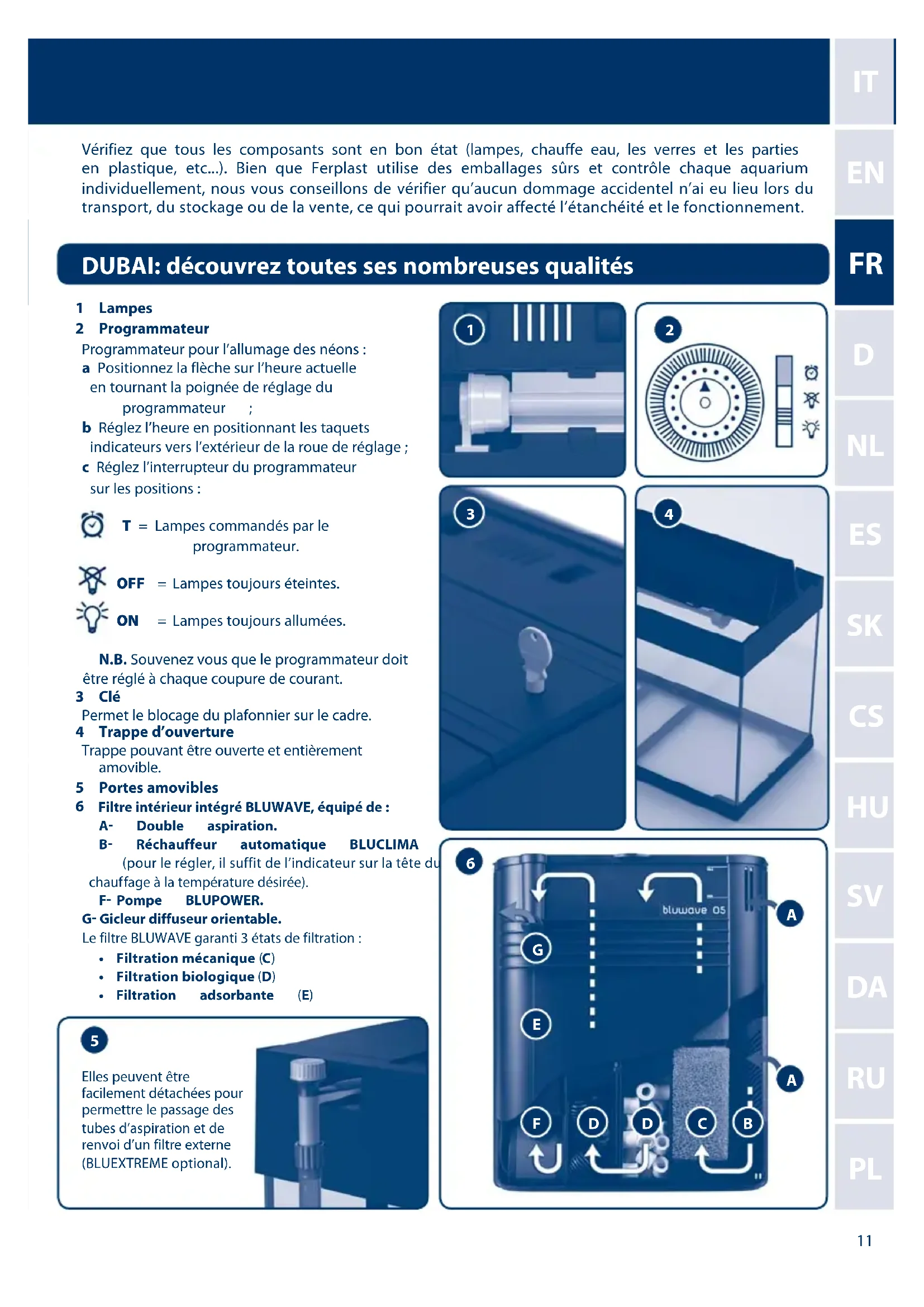 5 Agencez l’aquarium selon vos préférences (vous pouvez également recourir aux conseils de votre revendeur). 6 Réglez la température du chauffage (si présent) selon les espèces de poissons et de plantes choisies (par exemple, pour les aquariums tropicaux d’eau douce, la température moyenne est d’environ 25-26°C). 7 Mettre les BLUSTART (activateurs bactéries) dans le premier compartiment du filtre BLUWAVE : 1 capsule pour le BLUWAVE 05 (DUBAI 80-100-90 corner) et 2 capsules pour le BLUWAVE 07 (DUBAI 120). 8 Réglez l’heure de l’éclairage au moyen du programmateur et uniquement à ce moment là, branchez les prises au courant électrique et vérifiez que tout fonctionne correctement. En cas de problèmes, adressez vous à votre revendeur habituel. 9 Nous vous conseillons d’éclairer l’aquarium environ 8 heures par jour : au cas où un développement excessif d’algues est observé, réduisez la période d’exposition à 7 heures : au cas où les plantes ont des difficultés à pousser, augmentez le temps d’exposition jusqu’à 9-10 heures. 10 Si vous utilisez des plantes vivantes, nous vous conseillons d’étaler sur le fond du bac 1 cm de gravillon fertilisé puis 2 cm de gravillon normal. Remplissez le bac en versant l’eau sur une assiette placée dans le fond, de façon à éviter que les matériaux utilisés pour la création du fond se soulèvent. En général, il est conseillé de mélanger à l’eau du robinet environ 50% d’eau déminéralisée dans l’aquarium; cependant ce pourcentage peut varier en fonction des caractéristiques chimiques de l’eau du robinet (faites vous conseiller et trouvez la quantité d’eau déminéralisée à ajouter auprès de votre revendeur habituel). 11 Pour un meilleur maintien des poissons, nous conseillons vivement d’attendre la maturation du filtre : c’est seulement 10-12 jours après l’ajout de BLUSTART, que l’on pourra introduire les premiers poissons. Avant cette opération, il est toutefois conseillé de contrôler les valeurs des principaux paramètres de l’eau en utilisant le mesureur MULTISTICK TESTER de Ferplast. Votre revendeur habituel pourra vous conseiller sur les valeurs idéales de température, dureté, etc, en fonction des espèces de plantes et poissons que vous avez décidé d’élever dans votre aquarium DUBAI. Il est utile de répéter ce contrôle avec une certaine fréquence. 12 Pendant la période nécessaire à la maturation du filtre, distribuez tous les jours une petite dose d’aliments secs : cela facilitera la formation de la flore bactérienne. 13 Au moment d’ajouter les poissons, insérez les capsules restantes d’activateur BLUSTART dans le premier compartiment du filtre. 14 Nous vous conseillons de ne pas mettre dans l’aquarium dès le début un nombre élevé de poissons, mais d’atteindre graduellement la population maximale. 15 Votre revendeur habituel pourra en outre vous conseiller dans le choix des poissons à insérer dans votre aquarium DUBAI ainsi que sur la quantité, la typologie et la fréquence d’administration de la nourriture. Les principales activités d’entretien que nous vous recommandons en plus de l’administration quotidienne de nourriture, du contrôle de la température et des valeurs chimiques sont : A siphonnez le fond le cas échéant au moyen d’un aspirateur approprié (BLU 9025/9027 de Ferplast) en vente auprès de votre revendeur habituel. B Ajoutez de l’eau déminéralisée pour remplacer l’eau évaporée. Rappelez vous que filtre interne doit toujours être submergé. C Remplacez 5 à 10% de l’eau du bac par de l’eau déminéralisée au moins 1 fois par mois. D Pour conserver un spectre lumineux optimal, remplacez la lampe chaque année (11):