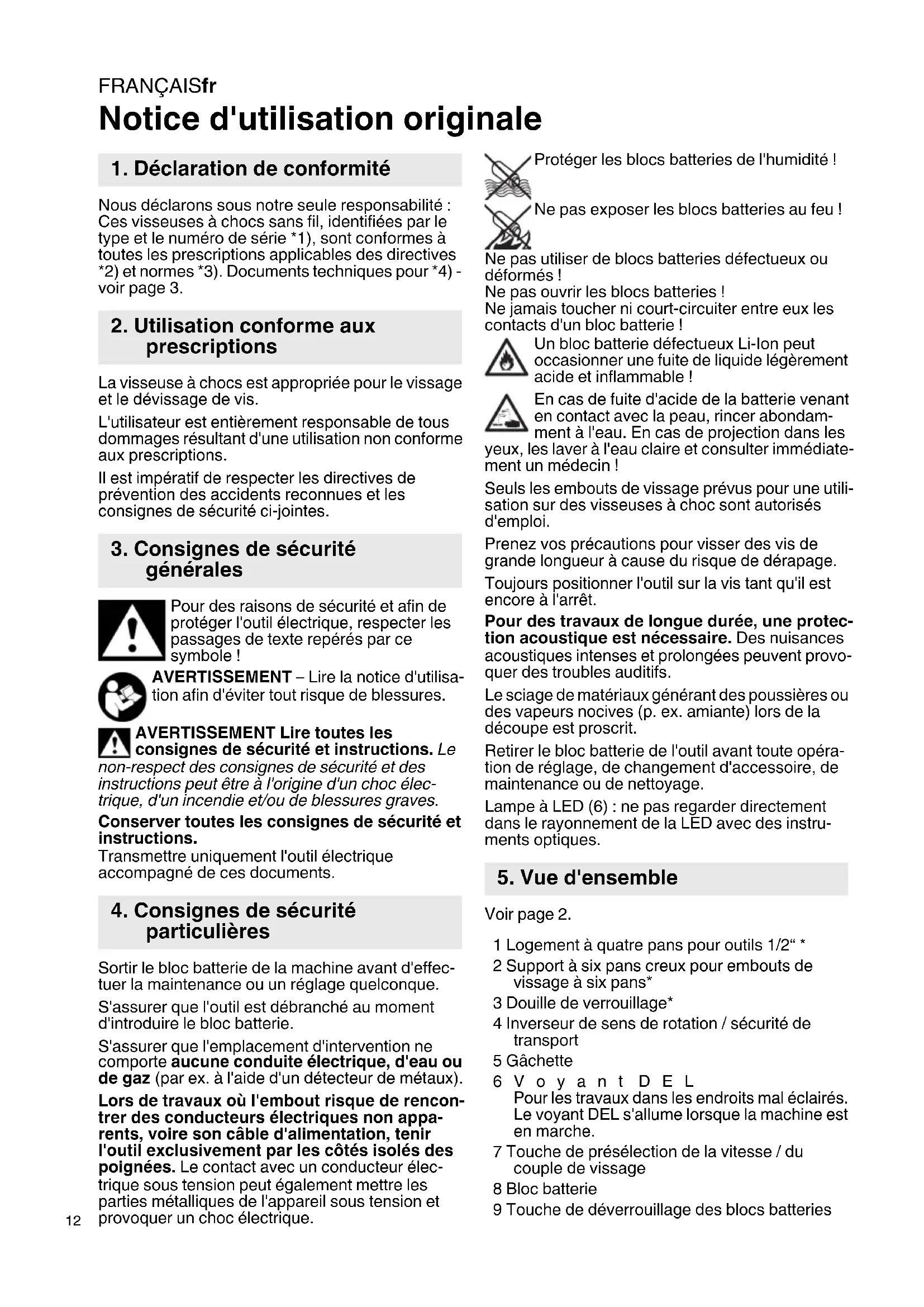 Notice d'utilisation originale Nous déclarons sous notre seule responsabilité : Ces visseuses à chocs sans fil, identifiées par le type et le numéro de série *1), sont conformes à toutes les prescriptions applicables des directives *2) et normes *3). Documents techniques pour *4) - voir page 3. La visseuse à chocs est appropriée pour le vissage et le dévissage de vis. L'utilisateur est entièrement responsable de tous dommages résultant d'une utilisation non conforme aux prescriptions. Il est impératif de respecter les directives de prévention des accidents reconnues et les consignes de sécurité ci-jointes. Pour des raisons de sécurité et afin de protéger l'outil électrique, respecter les passages de texte repérés par ce symbole ! AVERTISSEMENT – Lire la notice d'utilisa- tion afin d'éviter tout risque de blessures. AVERTISSEMENT Lire toutes les consignes de sécurité et instructions. Le non-respect des consignes de sécurité et des instructions peut être à l'origine d'un choc élec- trique, d'un incendie et/ou de blessures graves. Conserver toutes les consignes de sécurité et instructions. Transmettre uniquement l'outil électrique accompagné de ces documents. Sortir le bloc batterie de la machine avant d'effec- tuer la maintenance ou un réglage quelconque. S'assurer que l'outil est débranché au moment d'introduire le bloc batterie. S'assurer que l'emplacement d'intervention ne comporte aucune conduite électrique, d'eau ou de gaz (par ex. à l'aide d'un détecteur de métaux). Lors de travaux où l'embout risque de rencon- trer des conducteurs électriques non appa- rents, voire son câble d'alimentation, tenir l'outil exclusivement par les côtés isolés des poignées. Le contact avec un conducteur élec- trique sous tension peut également mettre les parties métalliques de l'appareil sous tension et provoquer un choc électrique. Protéger les blocs batteries de l'humidité ! Ne pas exposer les blocs batteries au feu ! Ne pas utiliser de blocs batteries défectueux ou déformés ! Ne pas ouvrir les blocs batteries ! Ne jamais toucher ni court-circuiter entre eux les contacts d'un bloc batterie ! Un bloc batterie défectueux Li-Ion peut occasionner une fuite de liquide légèrement acide et inflammable ! En cas de fuite d'acide de la batterie venant en contact avec la peau, rincer abondam- ment à l'eau. En cas de projection dans les yeux, les laver à l'eau claire et consulter immédiate- ment un médecin ! Seuls les embouts de vissage prévus pour une utili- sation sur des visseuses à choc sont autorisés d'emploi. Prenez vos précautions pour visser des vis de grande longueur à cause du risque de dérapage. Toujours positionner l'outil sur la vis tant qu'il est encore à l'arrêt. Pour des travaux de longue durée, une protec- tion acoustique est nécessaire. Des nuisances acoustiques intenses et prolongées peuvent provo- quer des troubles auditifs. Le sciage de matériaux générant des poussières ou des vapeurs nocives (p. ex. amiante) lors de la découpe est proscrit. Retirer le bloc batterie de l'outil avant toute opéra- tion de réglage, de changement d'accessoire, de maintenance ou de nettoyage. Lampe à LED (6) : ne pas regarder directement dans le rayonnement de la LED avec des instru- ments optiques. Voir page 2. 1 Logement à quatre pans pour outils 1/2“ * 2 Support à six pans creux pour embouts de vissage à six pans* 3 Douille de verrouillage* 4 Inverseur de sens de rotation / sécurité de transport 5 Gâchette 6Voyant DEL Pour les travaux dans les endroits mal éclairés. Le voyant DEL s'allume lorsque la machine est en marche. 7 Touche de présélection de la vitesse / du couple de vissage 8 Bloc batterie 9 Touche de déverrouillage des blocs batteries