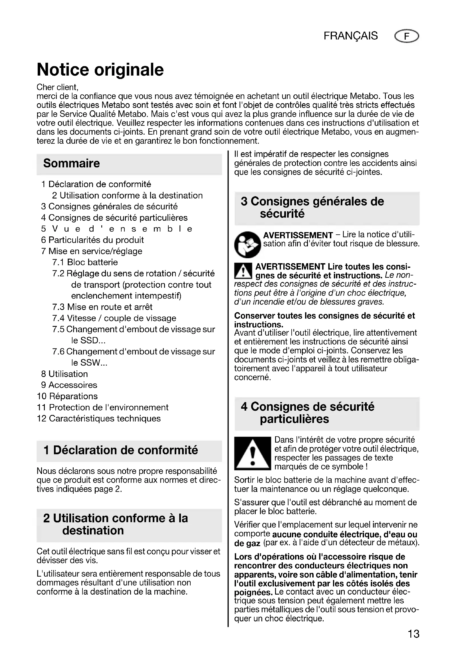le SSW... 8 Utilisation 9 Accessoires 10 Réparations 11 Protection de l'environnement 12 Caractéristiques techniques Nous déclarons sous notre propre responsabilité que ce produit est conforme aux normes et direc- tives indiquées page 2. Cet outil électrique sans fil est conçu pour visser et dévisser des vis. L'utilisateur sera entièrement responsable de tous dommages résultant d'une utilisation non conforme à la destination de la machine. Il est impératif de respecter les consignes générales de protection contre les accidents ainsi que les consignes de sécurité ci-jointes. AVERTISSEMENT – Lire la notice d'utili- sation afin d'éviter tout risque de blessure. AVERTISSEMENT Lire toutes les consi- gnes de sécurité et instructions. Le non- respect des consignes de sécurité et des instruc- tions peut être à l'origine d'un choc électrique, d'un incendie et/ou de blessures graves. Conserver toutes les consignes de sécurité et instructions. Avant d'utiliser l'outil électrique, lire attentivement et entièrement les instructions de sécurité ainsi que le mode d'emploi ci-joints. Conservez les documents ci-joints et veillez à les remettre obliga- toirement avec l'appareil à tout utilisateur concerné. Dans l'intérêt de votre propre sécurité et afin de protéger votre outil électrique, respecter les passages de texte marqués de ce symbole ! Sortir le bloc batterie de la machine avant d'effec- tuer la maintenance ou un réglage quelconque. S'assurer que l'outil est débranché au moment de placer le bloc batterie. Vérifier que l'emplacement sur lequel intervenir ne comporte aucune conduite électrique, d'eau ou de gaz (par ex. à l'aide d'un détecteur de métaux). Lors d'opérations où l'accessoire risque de rencontrer des conducteurs électriques non apparents, voire son câble d'alimentation, tenir l'outil exclusivement par les côtés isolés des poignées. Le contact avec un conducteur élec- trique sous tension peut également mettre les parties métalliques de l'outil sous tension et provo- quer un choc électrique. Notice originale Cher client, merci de la confiance que vous nous avez témoignée en achetant un outil électrique Metabo. Tous les outils électriques Metabo sont testés avec soin et font l'objet de contrôles qualité très stricts effectués par le Service Qualité Metabo. Mais c'est vous qui avez la plus grande influence sur la durée de vie de votre outil électrique. Veuillez respecter les informations contenues dans ces instructions d'utilisation et dans les documents ci-joints. En prenant grand soin de votre outil électrique Metabo, vous en augmen- terez la durée de vie et en garantirez le bon fonctionnement. Sommaire 1 Déclaration de conformité 2 Utilisation conforme à la destination 3 Consignes générales de sécurité 4 Consignes de sécurité particulières 17026933_0311 SSW SSD 14_4 18.book Seite 13 Mittwoch, 9. März 2011 1:55 1314 FRANÇAIS