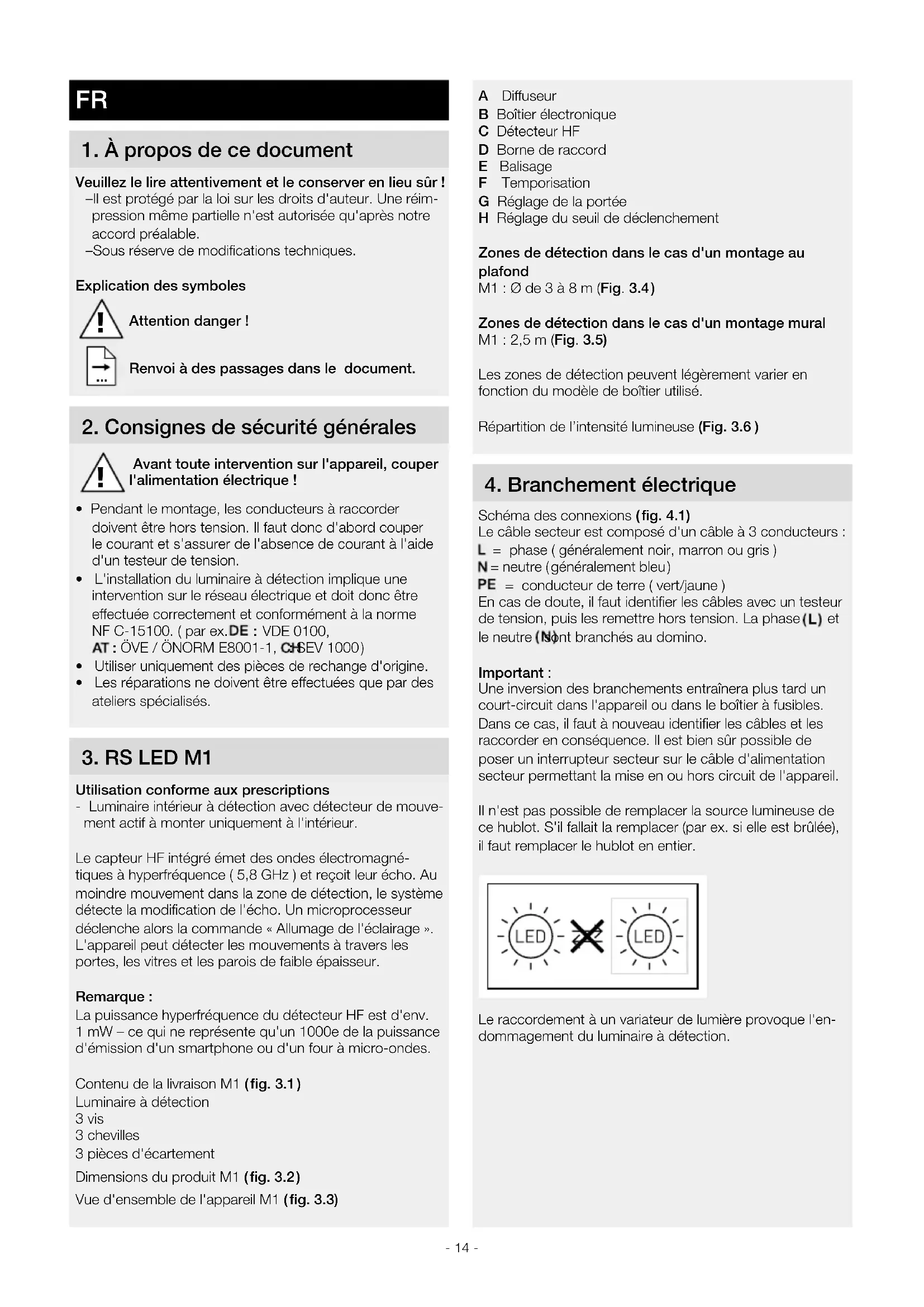 Utilisation conforme aux prescriptions - Luminaire intérieur à détection avec détecteur de mouve- ment actif à monter uniquement à l'intérieur. Le capteur HF intégré émet des ondes électromagné- tiques à hyperfréquence ( 5,8 GHz ) et reçoit leur écho. Au moindre mouvement dans la zone de détection, le système détecte la modification de l'écho. Un microprocesseur déclenche alors la commande « Allumage de l'éclairage». L'appareil peut détecter les mouvements à travers les portes, les vitres et les parois de faible épaisseur. Remarque : La puissance hyperfréquence du détecteur HF est d'env. 1 mW – ce qui ne représente qu'un 1000e de la puissance d'émission d'un smartphone ou d'un four à micro-ondes. Contenu de la livraison M1 ( fig.3.1 ) Luminaire à détection 3 vis 3 chevilles 3 pièces d'écartement Dimensions du produit M1 ( fig.3.2 ) Vue d'ensemble de l'appareil M1 ( fig.3.3) !- 15 -
