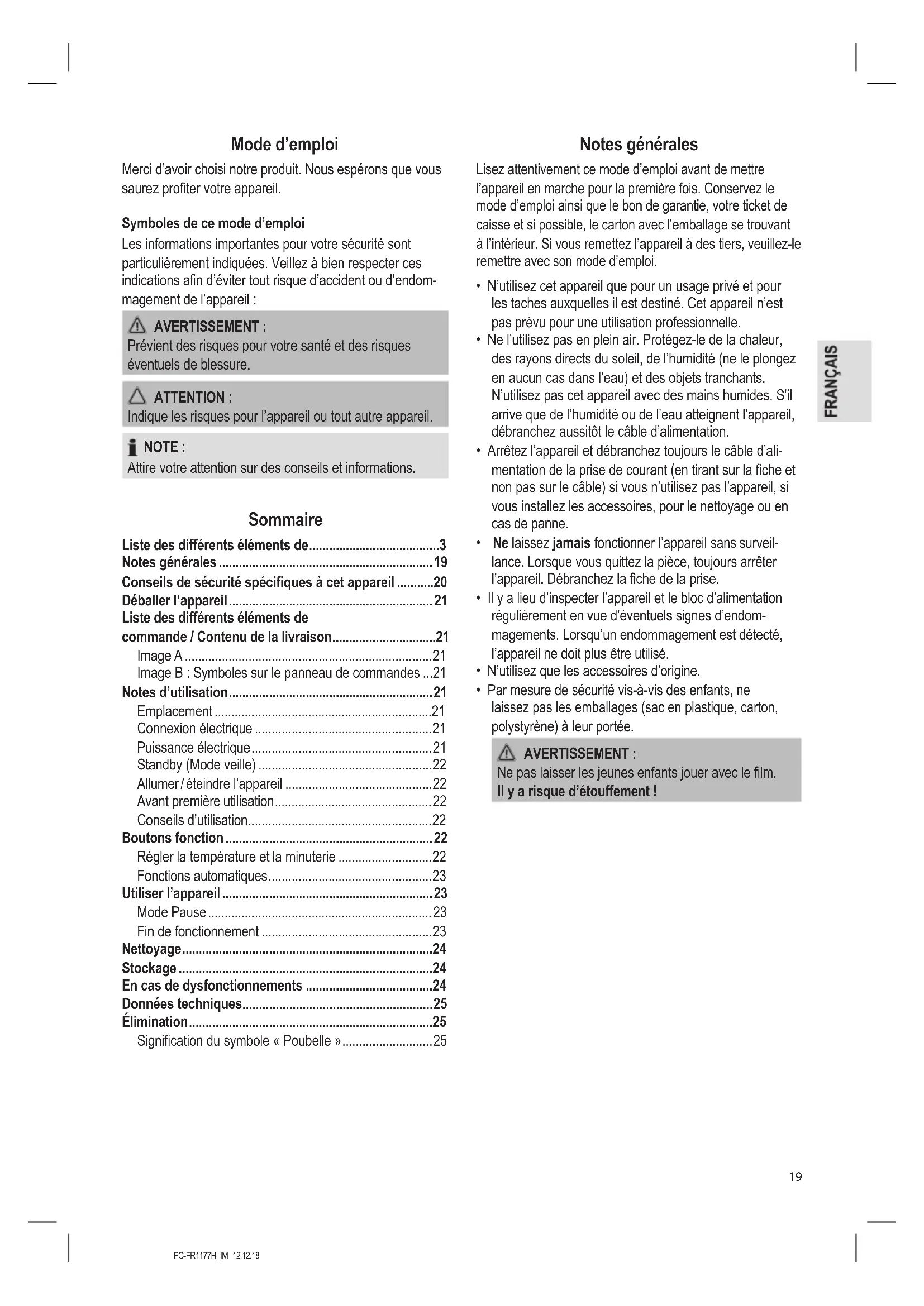 Problème Cause possible Solution Le réservoir de graisse avec le panier interne ne se met pas en position. Le panier est trop plein. Réduisez la quantité d’aliments. Le panier dans le réservoir de graisse n’est pas correctement installé. Insérez le panier correctement. Il doit s’enclencher en faisant du bruit. Données techniques Modèle : ..........................................................PC-FR 1177 H Alimentation : .....................................220 - 240 V~, 50 / 60 Hz Consommation : .......................................................... 1700 W Classe de protection : ............................................................ Poids net : ............................................................env. 5,75 kg Nous nous réservons le droit d’apporter des modications techniques ainsi que des modications de conception dans le cadre du développement continu de nos produits. Cet appareil a été contrôlé d’après toutes les directives européennes actuelles applicables, comme par exemple concernant la compatibilité électromagnétique et la basse tension. Cet appareil a été fabriqué en respect des régle- mentations techniques de sécurité les plus récentes. Élimination Signication du symbole « Poubelle » Protégez votre environnement, ne jetez pas vos appareils électriques avec les ordures mé- nagères. Utilisez, pour l’élimination de vos appareils électriques, les bornes de collecte prévues à cet effet où vous pouvez vous débarrasser des appareils que vous n’utilisez plus. Vous contribuez ainsi à éviter les impacts potentiels dans l’environnement et sur la santé de chacun, causés par une mauvaise élimination de ces déchets. Vous contribuez aussi au recyclage sous toutes ses formes des appareils électriques et électroniques usagés. Vous trouverez toutes les informations sur les bornes d’élimination des appareils auprès de votre commune ou de l’administration de votre communauté.PC-FR1177H_IM 12.12.18