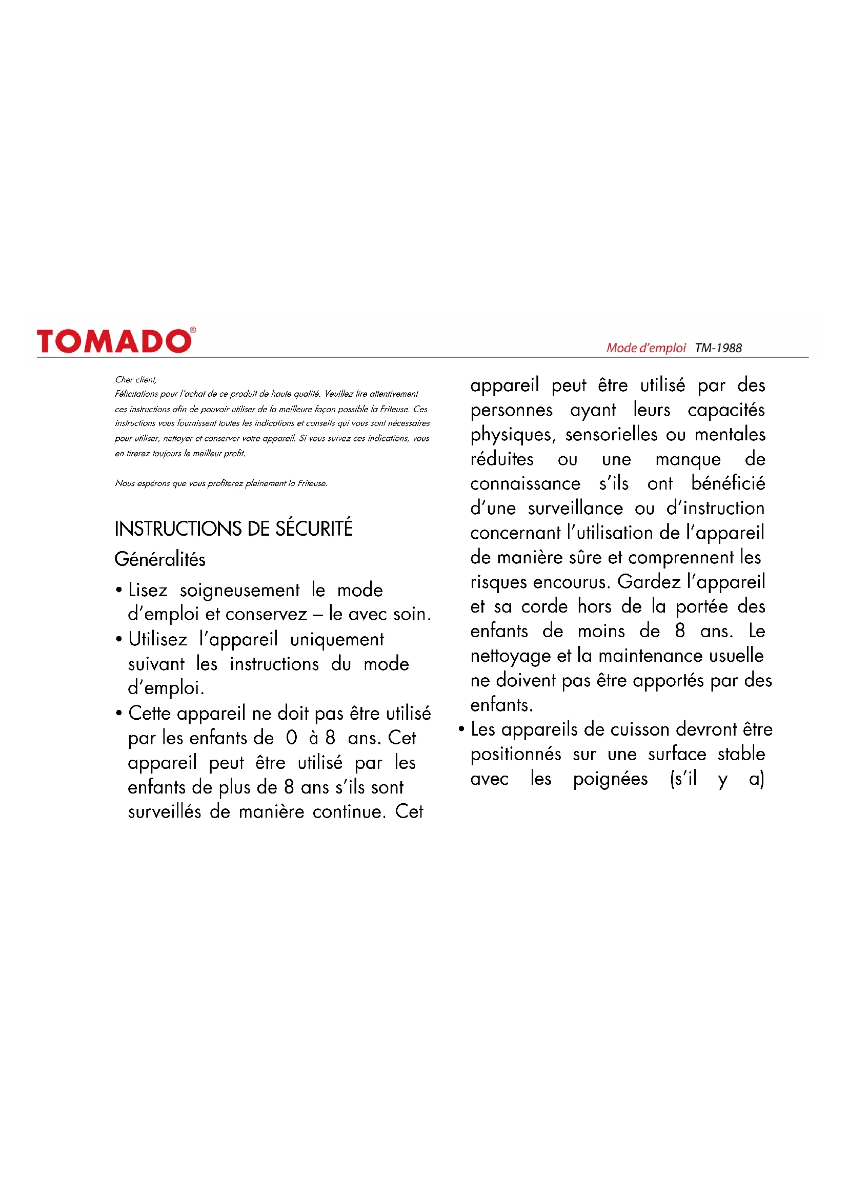 TM1988 - Friteuse Tomado - Notice d'utilisation et mode d'emploi gratuit