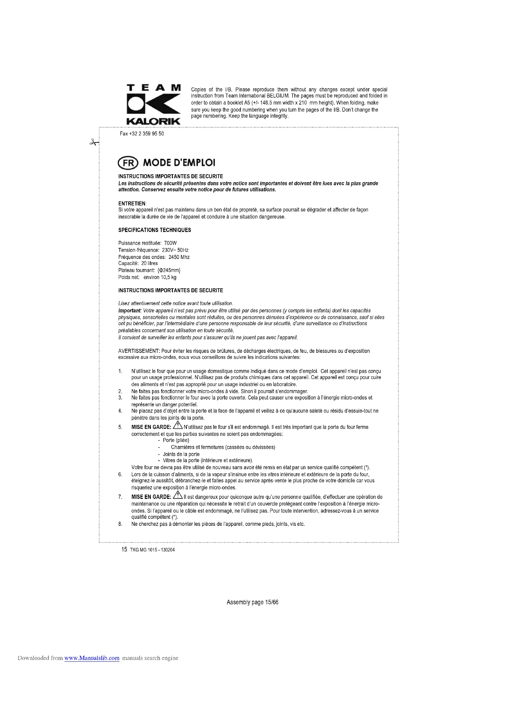 2. Les micro-ondes ne peuvent pas pénétrer à travers le métal. C'est pourquoi il ne faut pas utiliser de récipients en métal dans un four à micro-ondes. 3. N'utilisez pas de produits en papier recyclé car ils contiennent des petites particules de métal qui pourraient créer des étincelles, voire s'enflammer. 4. Il est conseillé d'utiliser des récipients ovales/ronds plutôt que des récipients carrés/rectangulaires étant donné que les aliments se trouvant dans les coins ont tendance à brûler. Downloaded from www.Manualslib.com manuals search engineCopies of the I/B. Please reproduce them without any changes except under special instruction from Team International BELGIUM. The pages must be reproduced and folded in order to obtain a booklet A5 (+/- 148.5 mm width x 210 mm height). When folding, make sure you keep the good numbering when you turn the pages of the I/B. Don’t change the page numbering. Keep the language integrity.