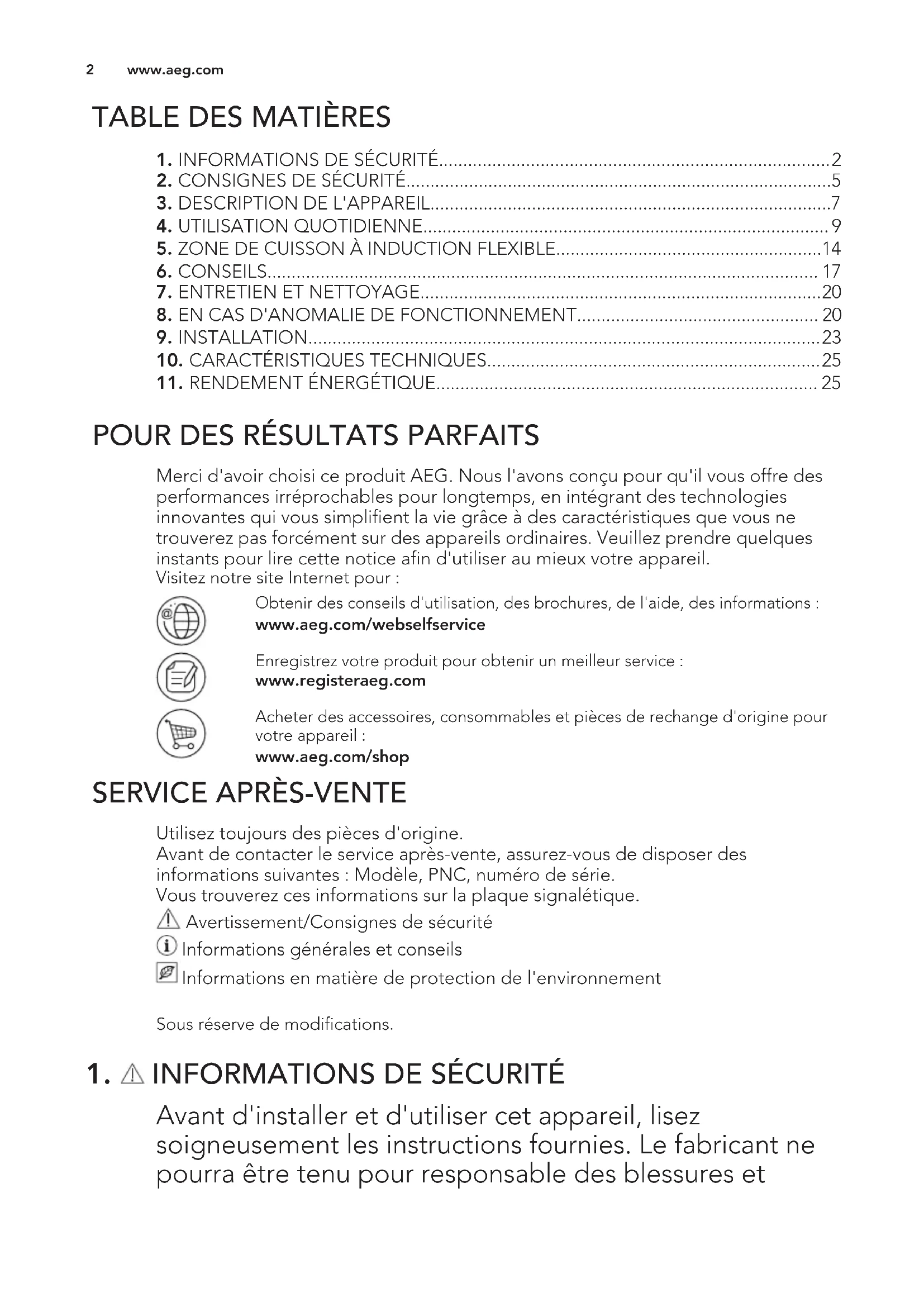 Merci d'avoir choisi ce produit AEG. Nous l'avons conçu pour qu'il vous offre des performances irréprochables pour longtemps, en intégrant des technologies innovantes qui vous simplifient la vie grâce à des caractéristiques que vous ne trouverez pas forcément sur des appareils ordinaires. Veuillez prendre quelques instants pour lire cette notice afin d'utiliser au mieux votre appareil. Visitez notre site Internet pour : Obtenir des conseils d'utilisation, des brochures, de l'aide, des informations : www.aeg.com/webselfservice Enregistrez votre produit pour obtenir un meilleur service : www.registeraeg.com Acheter des accessoires, consommables et pièces de rechange d'origine pour votre appareil : www.aeg.com/shop