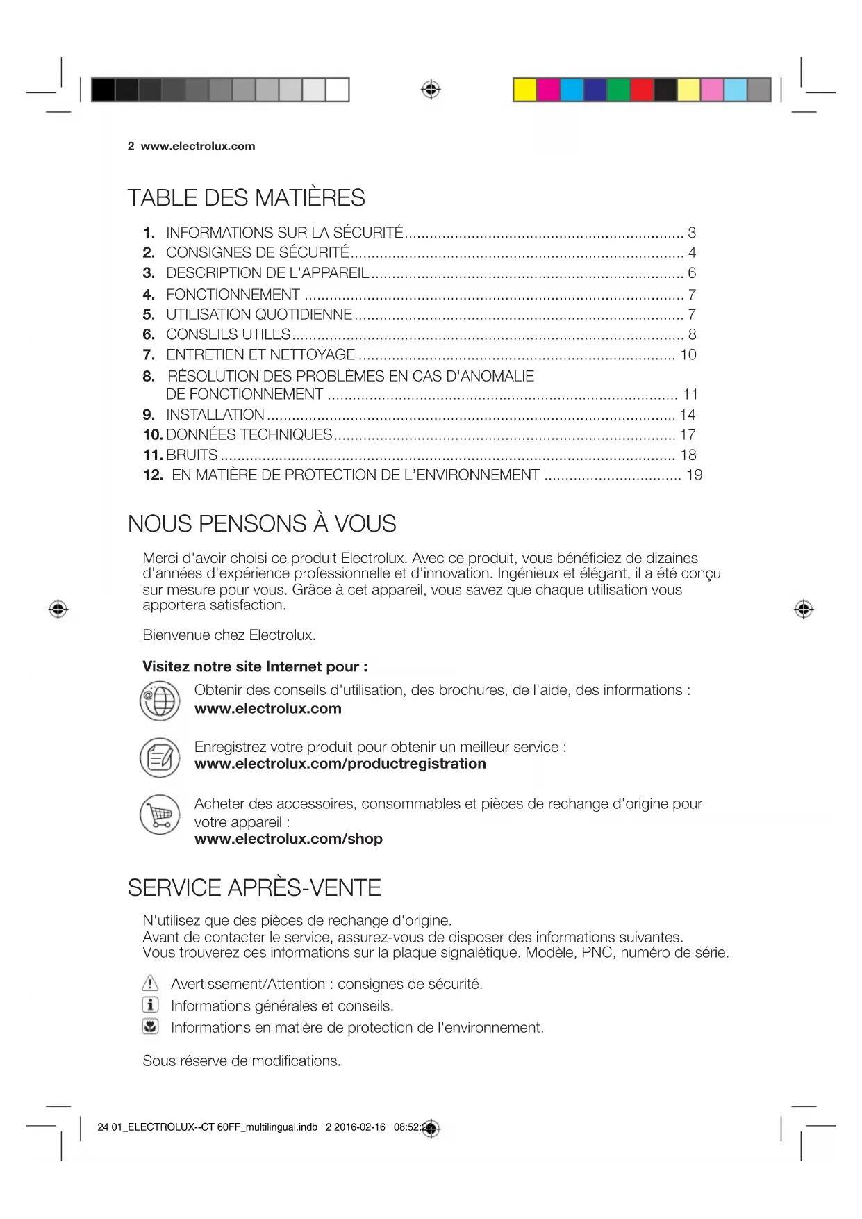 24 01_ELECTROLUX--CT 60FF_multilingual.indb 1 2016-02-16 08:52:22NOUS PENSONS À VOUS Merci d'avoir choisi ce produit Electrolux. Avec ce produit, vous bénéciez de dizaines d'années d'expérience professionnelle et d'innovation. Ingénieux et élégant, il a été conçu sur mesure pour vous. Grâce à cet appareil, vous savez que chaque utilisation vous apportera satisfaction. Bienvenue chez Electrolux. Visitez notre site Internet pour : Obtenir des conseils d'utilisation, des brochures, de l'aide, des informations : www.electrolux.com Enregistrez votre produit pour obtenir un meilleur service : www.electrolux.com/productregistration Acheter des accessoires, consommables et pièces de rechange d'origine pour votre appareil : www.electrolux.com/shop