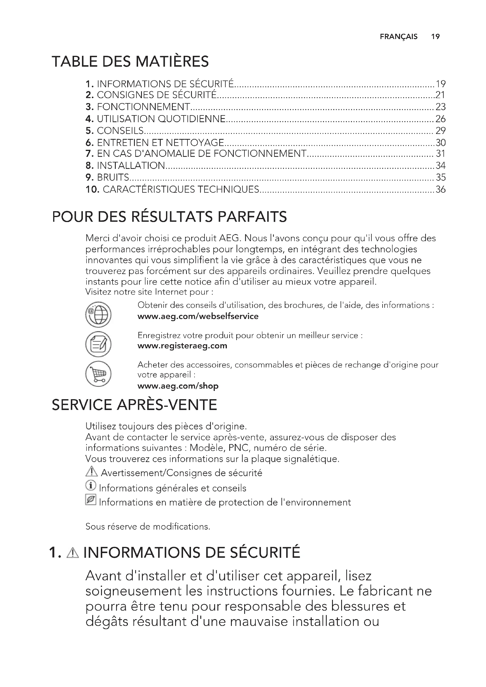Merci d'avoir choisi ce produit AEG. Nous l'avons conçu pour qu'il vous offre des performances irréprochables pour longtemps, en intégrant des technologies innovantes qui vous simplifient la vie grâce à des caractéristiques que vous ne trouverez pas forcément sur des appareils ordinaires. Veuillez prendre quelques instants pour lire cette notice afin d'utiliser au mieux votre appareil. Visitez notre site Internet pour : Obtenir des conseils d'utilisation, des brochures, de l'aide, des informations : www.aeg.com/webselfservice Enregistrez votre produit pour obtenir un meilleur service : www.registeraeg.com Acheter des accessoires, consommables et pièces de rechange d'origine pour votre appareil : www.aeg.com/shop