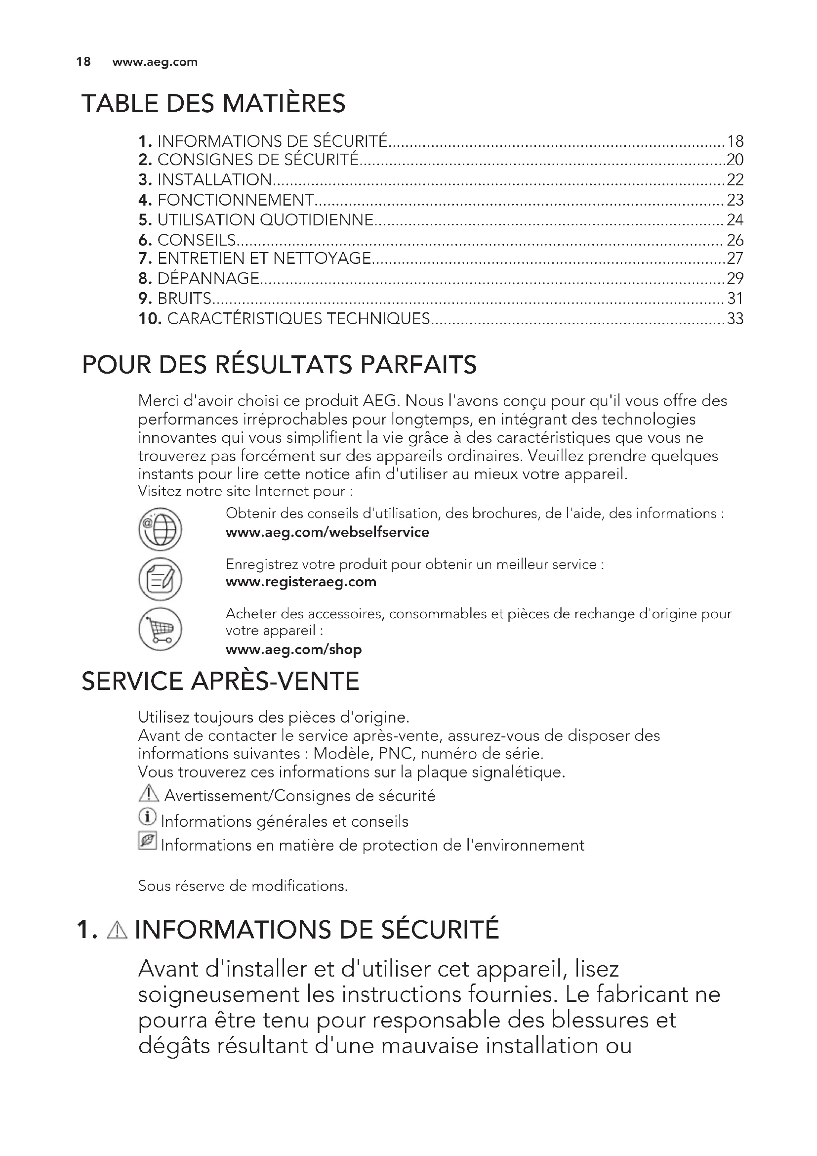 Avant d'installer et d'utiliser cet appareil, lisez soigneusement les instructions fournies. Le fabricant ne pourra être tenu pour responsable des blessures et dégâts résultant d'une mauvaise installation ou www.aeg.com 18utilisation. Conservez toujours les instructions dans un lieu sûr et accessible pour vous y référer ultérieurement.