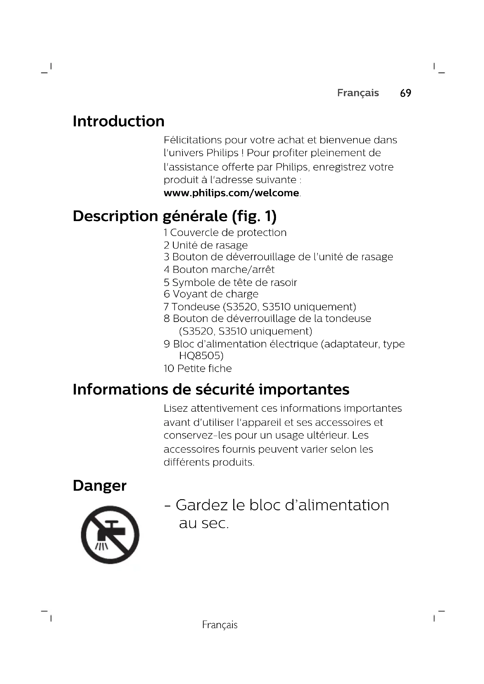 EspañolFrançais Introduction Félicitations pour votre achat et bienvenue dans l'univers Philips ! Pour profiter pleinement de l'assistance offerte par Philips, enregistrez votre produit à l'adresse suivante : www.philips.com/welcome. Description générale (fig. 1) 1 Couvercle de protection 2 Unité de rasage 3 Bouton de déverrouillage de l'unité de rasage 4 Bouton marche/arrêt 5 Symbole de tête de rasoir 6 Voyant de charge 7 Tondeuse (S3520, S3510 uniquement) 8 Bouton de déverrouillage de la tondeuse (S3520, S3510 uniquement) 9 Bloc d’alimentation électrique (adaptateur, type HQ8505) 10 Petite fiche Informations de sécurité importantes Lisez attentivement ces informations importantes avant d'utiliser l'appareil et ses accessoires et conservez-les pour un usage ultérieur. Les accessoires fournis peuvent varier selon les différents produits. Danger - Gardez le bloc d’alimentation au sec.