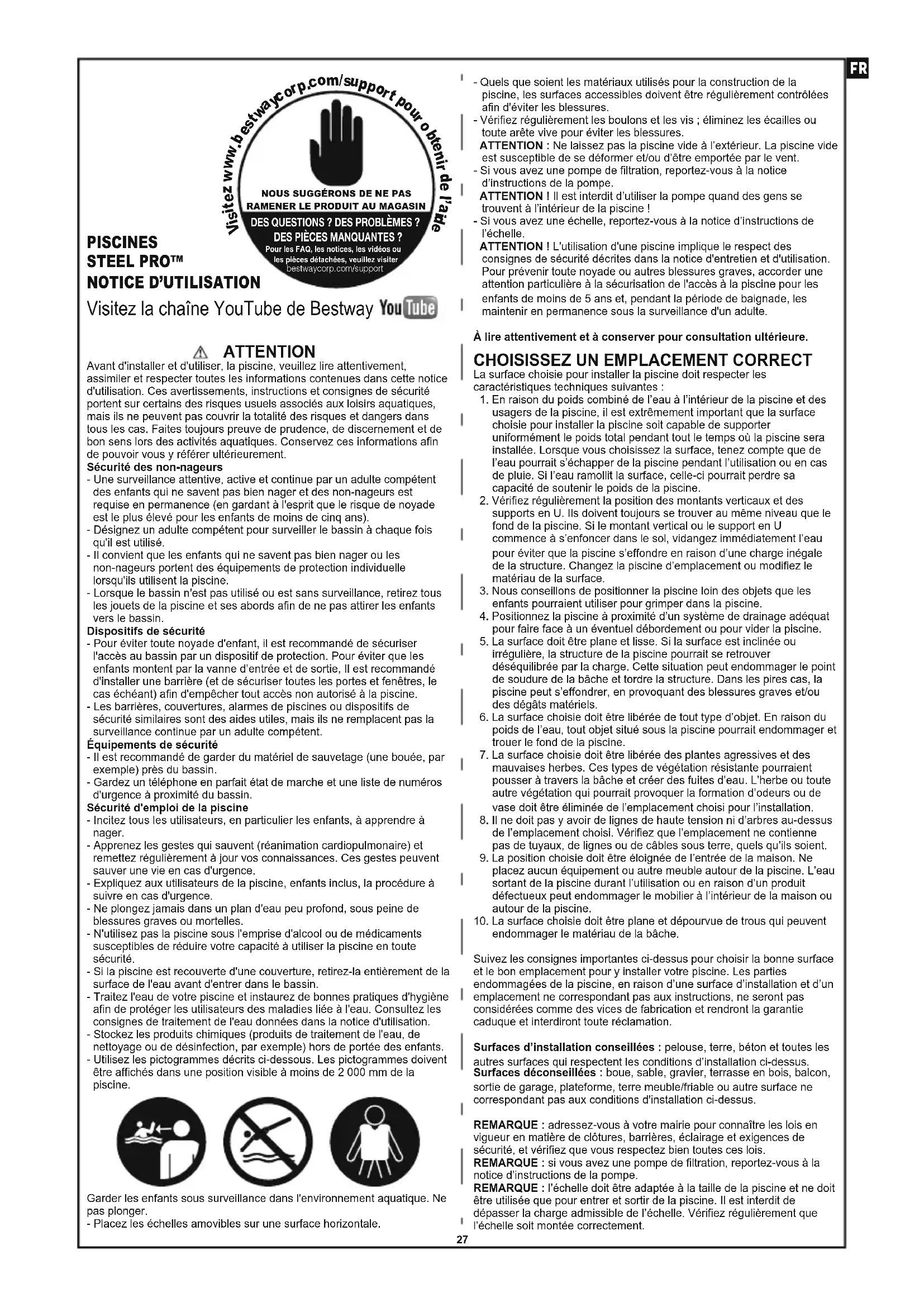 ATTENTION Avant d'installer et d'utiliser, la piscine, veuillez lire attentivement, assimiler et respecter toutes les informations contenues dans cette notice d'utilisation. Ces avertissements, instructions et consignes de sécurité portent sur certains des risques usuels associés aux loisirs aquatiques, mais ils ne peuvent pas couvrir la totalité des risques et dangers dans tous les cas. Faites toujours preuve de prudence, de discernement et de bon sens lors des activités aquatiques. Conservez ces informations afin de pouvoir vous y référer ultérieurement.Sécurité des non-nageurs- Une surveillance attentive, active et continue par un adulte compétent des enfants qui ne savent pas bien nager et des non-nageurs est requise en permanence (en gardant à l'esprit que le risque de noyade est le plus élevé pour les enfants de moins de cinq ans).- Désignez un adulte compétent pour surveiller le bassin à chaque fois qu'il est utilisé.- Il convient que les enfants qui ne savent pas bien nager ou les non-nageurs portent des équipements de protection individuelle lorsqu'ils utilisent la piscine.- Lorsque le bassin n'est pas utilisé ou est sans surveillance, retirez tous les jouets de la piscine et ses abords afin de ne pas attirer les enfants vers le bassin.Dispositifs de sécurité- Pour éviter toute noyade d'enfant, il est recommandé de sécuriser l'accès au bassin par un dispositif de protection. Pour éviter que les enfants montent par la vanne d’entrée et de sortie, Il est recommandé d'installer une barrière (et de sécuriser toutes les portes et fenêtres, le cas échéant) afin d'empêcher tout accès non autorisé à la piscine.- Les barrières, couvertures, alarmes de piscines ou dispositifs de sécurité similaires sont des aides utiles, mais ils ne remplacent pas la surveillance continue par un adulte compétent.Équipements de sécurité- Il est recommandé de garder du matériel de sauvetage (une bouée, par exemple) près du bassin.- Gardez un téléphone en parfait état de marche et une liste de numéros d'urgence à proximité du bassin.Sécurité d'emploi de la piscine- Incitez tous les utilisateurs, en particulier les enfants, à apprendre à nager.- Apprenez les gestes qui sauvent (réanimation cardiopulmonaire) et remettez régulièrement à jour vos connaissances. Ces gestes peuvent sauver une vie en cas d'urgence.- Expliquez aux utilisateurs de la piscine, enfants inclus, la procédure à suivre en cas d'urgence.- Ne plongez jamais dans un plan d'eau peu profond, sous peine de blessures graves ou mortelles.- N'utilisez pas la piscine sous l'emprise d'alcool ou de médicaments susceptibles de réduire votre capacité à utiliser la piscine en toute sécurité.- Si la piscine est recouverte d'une couverture, retirez-la entièrement de la surface de l'eau avant d'entrer dans le bassin.- Traitez l'eau de votre piscine et instaurez de bonnes pratiques d'hygiène afin de protéger les utilisateurs des maladies liée à l'eau. Consultez les consignes de traitement de l'eau données dans la notice d'utilisation.- Stockez les produits chimiques (produits de traitement de l'eau, de nettoyage ou de désinfection, par exemple) hors de portée des enfants.- Utilisez les pictogrammes décrits ci-dessous. Les pictogrammes doivent être affichés dans une position visible à moins de 2 000 mm de la piscine.Garder les enfants sous surveillance dans l'environnement aquatique. Ne pas plonger.- Placez les échelles amovibles sur une surface horizontale. Visitez la chaîne YouTube de Bestway PISCINES STEEL PRO™