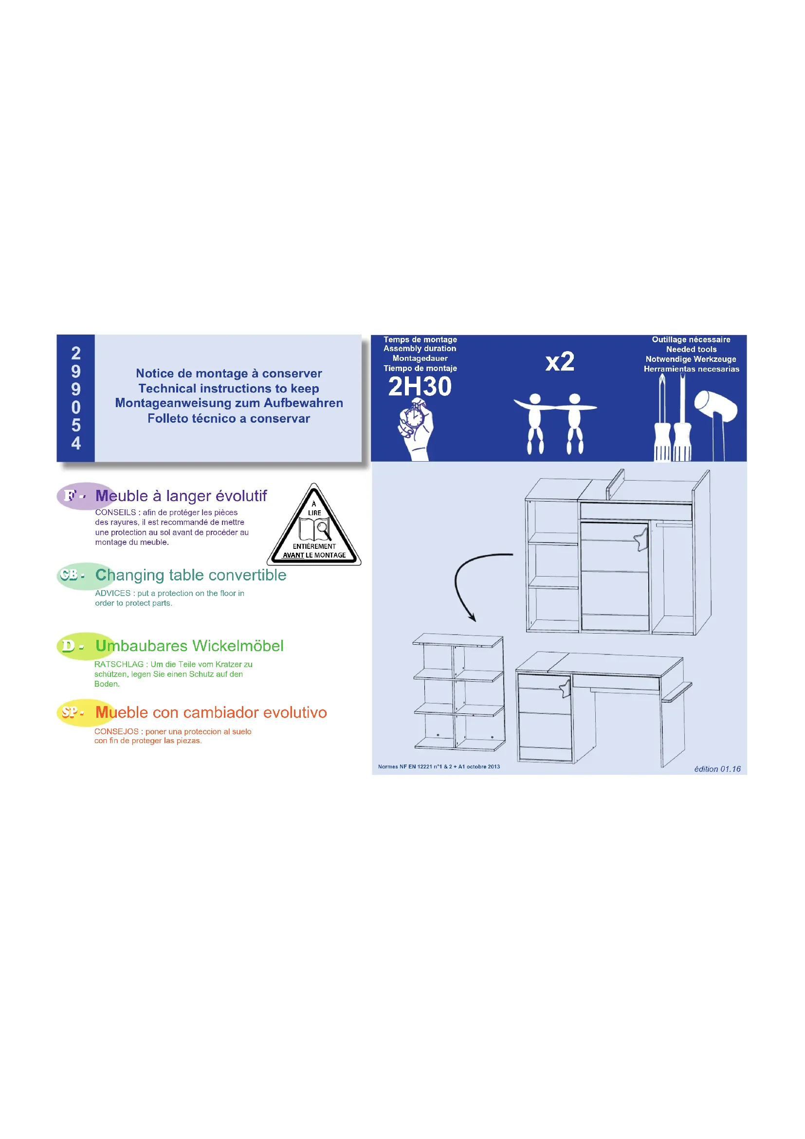 LIRE ENTIÈREMENT AVANT LE MONTAGENormes NF EN 12221 n°1 & 2 + A1 octobre 2013Temps de montageAssembly durationMontagedauerTiempo de montaje Outillage nécessaireNeeded toolsNotwendige WerkzeugeHerramientas necesarias