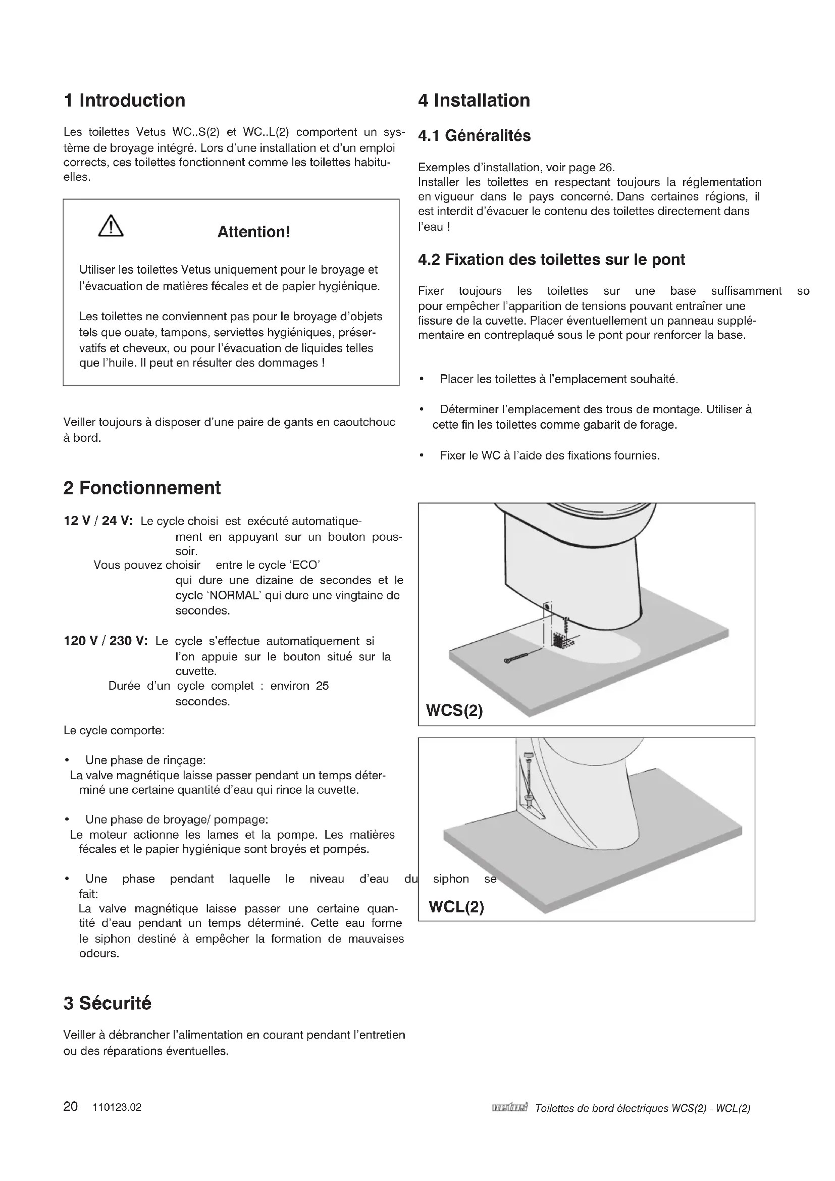 - Dafür sorgen, dass ein Wasserdruck von mindestens 1,5 bar vorhanden ist. 12 V / 24 V120 V / 230 V 12 V / 24 V 120 V / 230 V DEUTSCH20 110123.02 Toilettes de bord électriques WCS(2) - WCL(2) 1 Introduction Les toilettes Vetus WC..S(2) et WC..L(2) comportent un sys- tème de broyage intégré. Lors d’une installation et d’un emploi corrects, ces toilettes fonctionnent comme les toilettes habitu- elles.