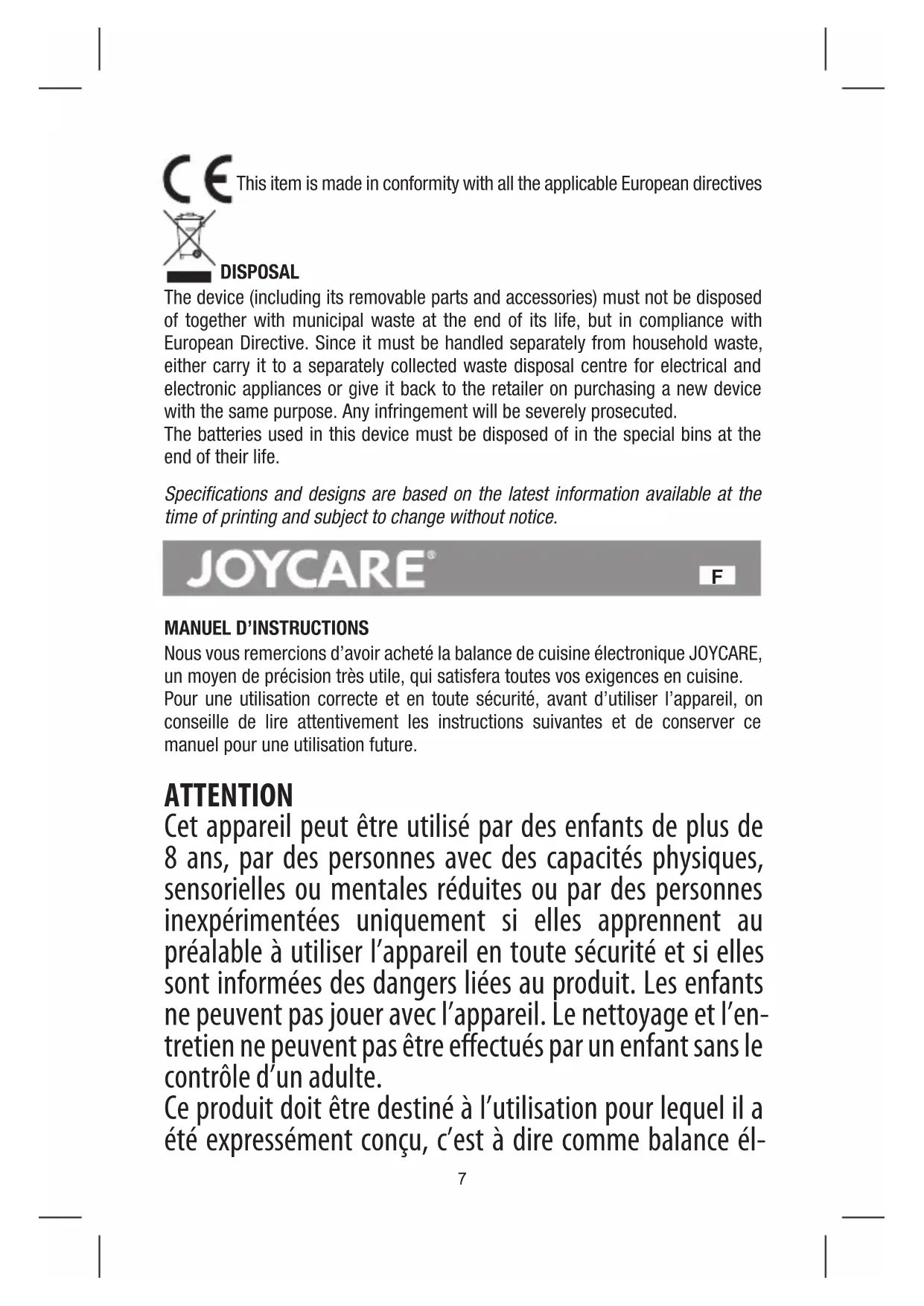 nettoyage de la balance avec un tissu humide. Eviter toutes inltrations d’eau. Ne jamais utiliser de détergents chimiques. Ne jamais plonger le produit dans l’eau. En ce qui concerne l’instrument de précision, la balance doit être traitée toujours avec soin. Ne pas la faire tomber. Ne pas ouvrir ou chercher à réparer l’appareil. Toutes réparations doivent être réalisées par des techniciens spécialisés ; dans le cas contraire la garantie n’aura plus de validité. Ne pas ranger l’appareil dans des lieux trop humides et poussiéreux. Ne pas exposer l’appareil au soleil et aux hautes températures. Si l’appareil n’est pas utilisé pendant une longue période, enlever les batteries, car l’écoulement de liquide des batteries peut endommager le produit. Lorsque la balance est éteinte, il ne faut appuyer aucun objet sur le plateau. En cas de défaillance de l’appareil: Vériez que la pile est correctement insérée dans leur logement. En cas de problèmes persistants, contactez le centre de service technique JOYCARE. Le produit a été projeté et fabriqué en respectant toutes les normes européennes applicables. ÉCOULEMENT Quand l’appareil et/ou ses pièces déplaçables ne seront plus utilisables, l’élimination sera effectuée selon les normes en vigueur de la Directive européenne et ne devra pas être éliminé dans les ordures urbaines. L’appareil ne doit pas être jeté dans les ordures domestiques,mais dans un centre des récoltes différenciées pour les appareils électriques et électroniques, ou renvoyé au revendeur au moment de l’achat d’un nouvel appareil équivalent. En cas d’entorse au règlement, on prévoit des sévères sanctions. Quand l’appareil ne sera plus utile, les batteries utilisées seront éliminées dans des spéciaux récipients. Tous ces renseignements et illustrations se basent sur les informations disponibles au moment où le manuel d’instruction a été écrit, donc ils peuvent varier dans tous moments.