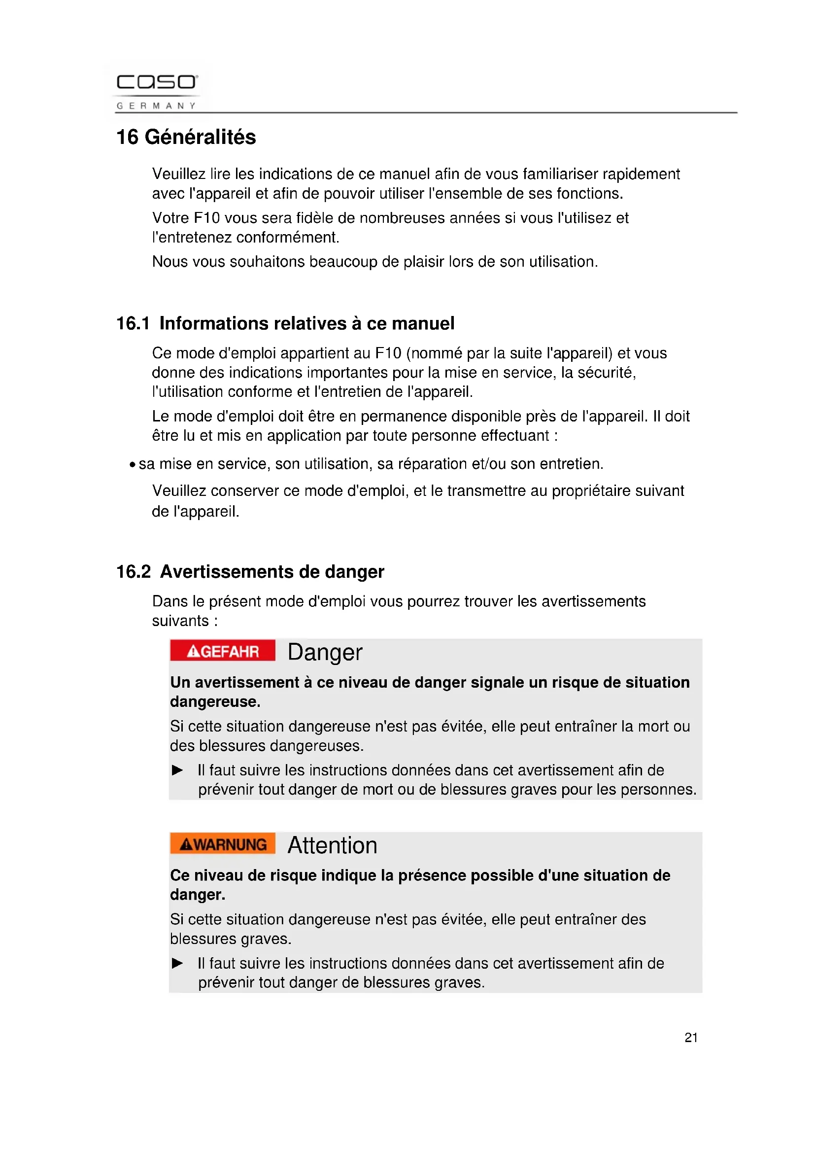 Appliance Sales & Service 840 Folsom Street San Francisco, CA 94107 USA service@caso-germany.com US-service no.: (855) 230 – 9284, OPTION 1 International service no. : +49 2932 – 54766 – 79 International fax no. : +49 2932 – 54766 – 7730 23 Garantie (Europe) Sur ce produit nous accordons une garantie de 24 mois à partir de la date d'achat pour les manques et les défauts de fabrication ou de matériaux. Vous conserver entièrement vos droits de garantie légale accordés par le §439 et suivants BGB-E. La garantie ne concerne pas les dégâts causés par une utilisation ou une manipulation non conforme, ainsi que les défauts qui n'influencent que faiblement le fonctionnement ou la valeur de l'appareil. D'autre part ne sont pas garantis également les pièces d'usure, les dommages de transport dans la mesure où ils ne sont pas sous notre responsabilité, ainsi que les dommages occasionnés par des réparations qui n'ont pas été effectuées par nos soins. La construction et la puissance de cet appareil sont conçues pour un usage ménager privé. Un éventuel usage commercial reste couvert par la garantie dans la mesure où cette utilisation ne dépasse pas le cadre des contraintes d'un usage privé. L'appareil n'est pas prévu pour un usage commercial plus intensif. En cas de recours en garantie justifié nous déciderons de réparer l'appareil ou de le remplacer par un appareil sans défaut. Les manques doivent être signalés dans un délai de 14 jours après livraison. Tout autre recours est sans objet. Pour tout recours en garantie nous vous prions d'entrer en contact avec nos services avant de nous retourner l'appareil (toujours avec le bon d'achat!). caso Germany / Braukmann GmbH Raiffeisenstraße 9 D-59757 Arnsberg Service-Hotline International: Tel.: +49 (0) 29 32 / 80 55 4 – 99 Fax: +49 (0) 29 32 / 80 55 4 – 77 eMail: kundenservice@caso-germany.de Internet: www.caso-germany.de31 24 In generale Legga le informazioni qui contenute, affinché acquisti rapidamente familiarità con il suo apparecchio e affinché possa utilizzare appieno le sue funzioni. Il Suo F 10 Le renderà un buon servizio per molti anni, se lo tratterà e lo curerà in modo adeguato. Ci auguriamo che il suo utilizzo Le procuri molta gioia.