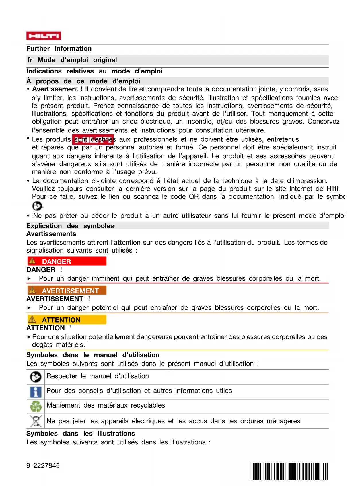 - La documentation ci-jointe correspond à l'état actuel de la technique à la date d'impression. Veuillez toujours consulter la dernière version sur la page du produit sur le site Internet de Hilti. Pour ce faire, suivez le lien ou scannez le code QR dans la documentation, indiqué par le symbole