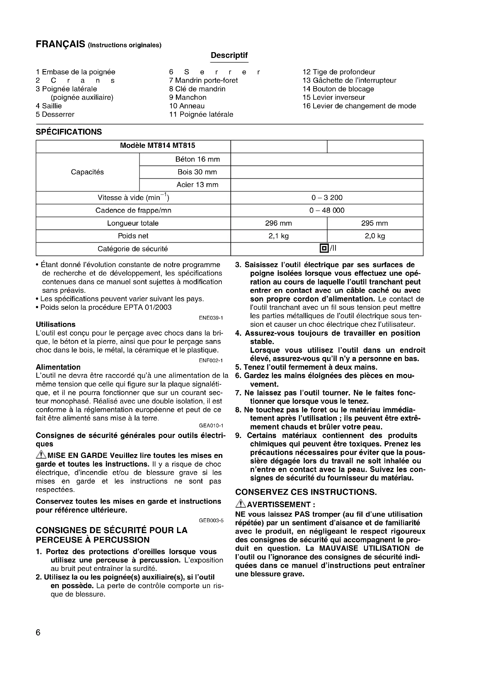 MT815 - Perceuse Maktec - Notice d'utilisation et mode d'emploi gratuit