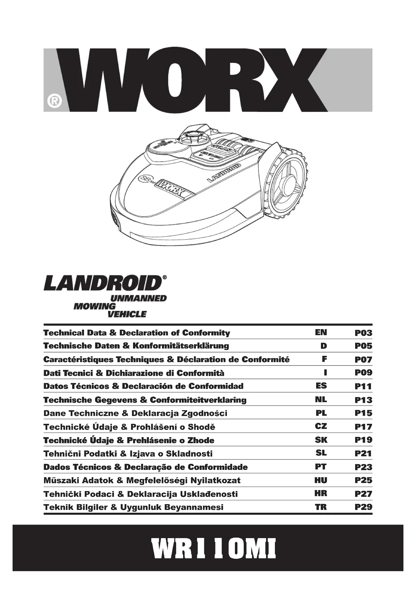 Déclaration de conformité Nous, POSITEC Germany GmbH Konrad-Adenauer-Ufer 37 50668 Köln Déclarons ce produit Description WORX Robot de fauchage à pelouse Modèle WR110MI (100-199 -désignations des pièces, illustration de la Robot de fauchage à pelouse) Fonction Tondeuse à gazon Est conforme aux directives suivantes : 2006/42/EC, 2014/30/EU, 2014/35/EU, 2011/65/EU, 2000/14/EC amendée par 2005/88/EC, 1999/5/EC 2000/14/EC amendée par 2005/88/EC - Procédure d’évaluation de la conformité conformément à Annex V - Niveau de pression acoustique 67.6dB(A)) - Niveau d’intensité acoustique 68dB(A)) Et conforme aux normes EN 60335-1, EN 50636-2-107, EN 60335-2-29, EN 62233, EN ISO 3744, EN 55014-1, EN 55014-2, EN 61000-3-2, EN 61000-3-3 EN 300 328, EN 301 489-17, EN 62311 La personne autorisée à compiler le dossier technique, Nom Russell Nicholson Adresse Positec Power Tools (Europe) Ltd, PO Box 6242, Newbury, RG14 9LT, UK Suzhou 2016/12/05 Allen Ding Ingénieur en chef adjoint, Essais & CertificationRobot tosaerba I
