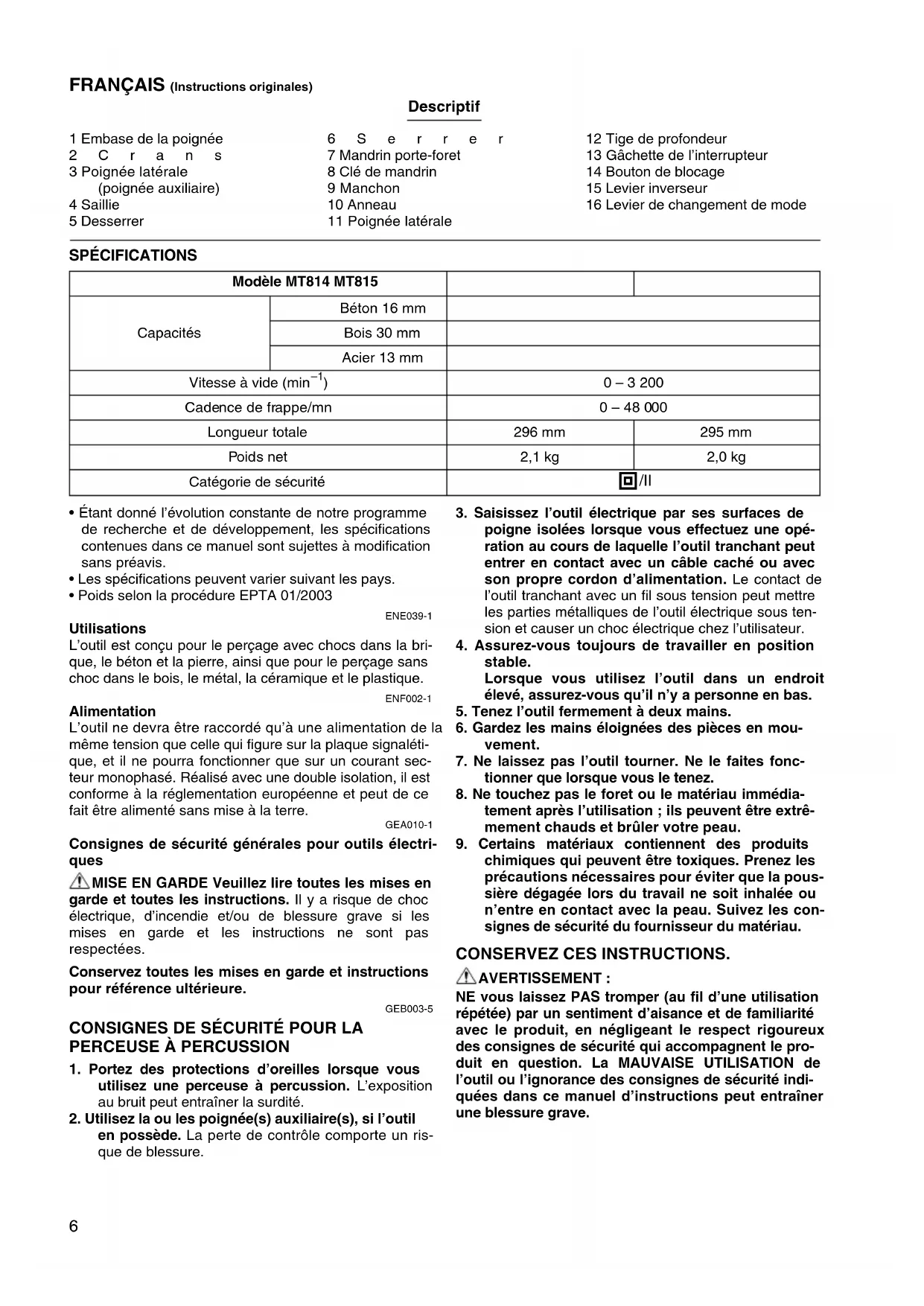 MT814 - Perceuse Maktec - Notice d'utilisation et mode d'emploi gratuit