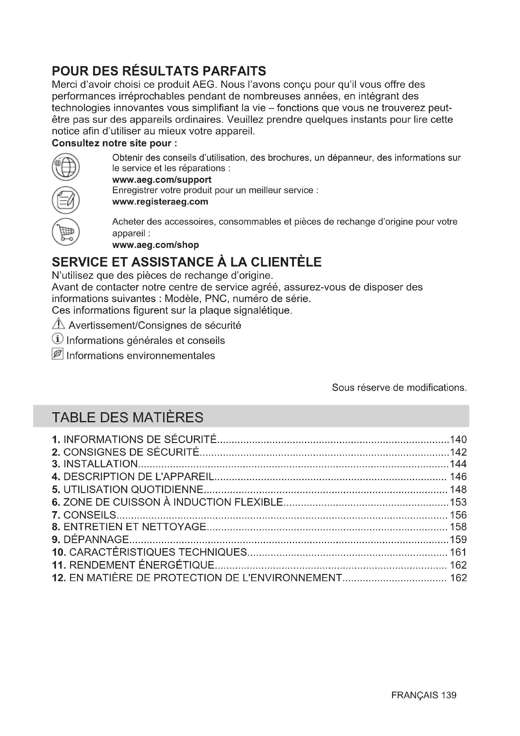 Merci d’avoir choisi ce produit AEG. Nous l’avons conçu pour qu’il vous offre des performances irréprochables pendant de nombreuses années, en intégrant des technologies innovantes vous simplifiant la vie – fonctions que vous ne trouverez peut- être pas sur des appareils ordinaires. Veuillez prendre quelques instants pour lire cette notice afin d’utiliser au mieux votre appareil. Consultez notre site pour : Obtenir des conseils d’utilisation, des brochures, un dépanneur, des informations sur le service et les réparations : www.aeg.com/support Enregistrer votre produit pour un meilleur service : www.registeraeg.com Acheter des accessoires, consommables et pièces de rechange d’origine pour votre appareil : www.aeg.com/shop