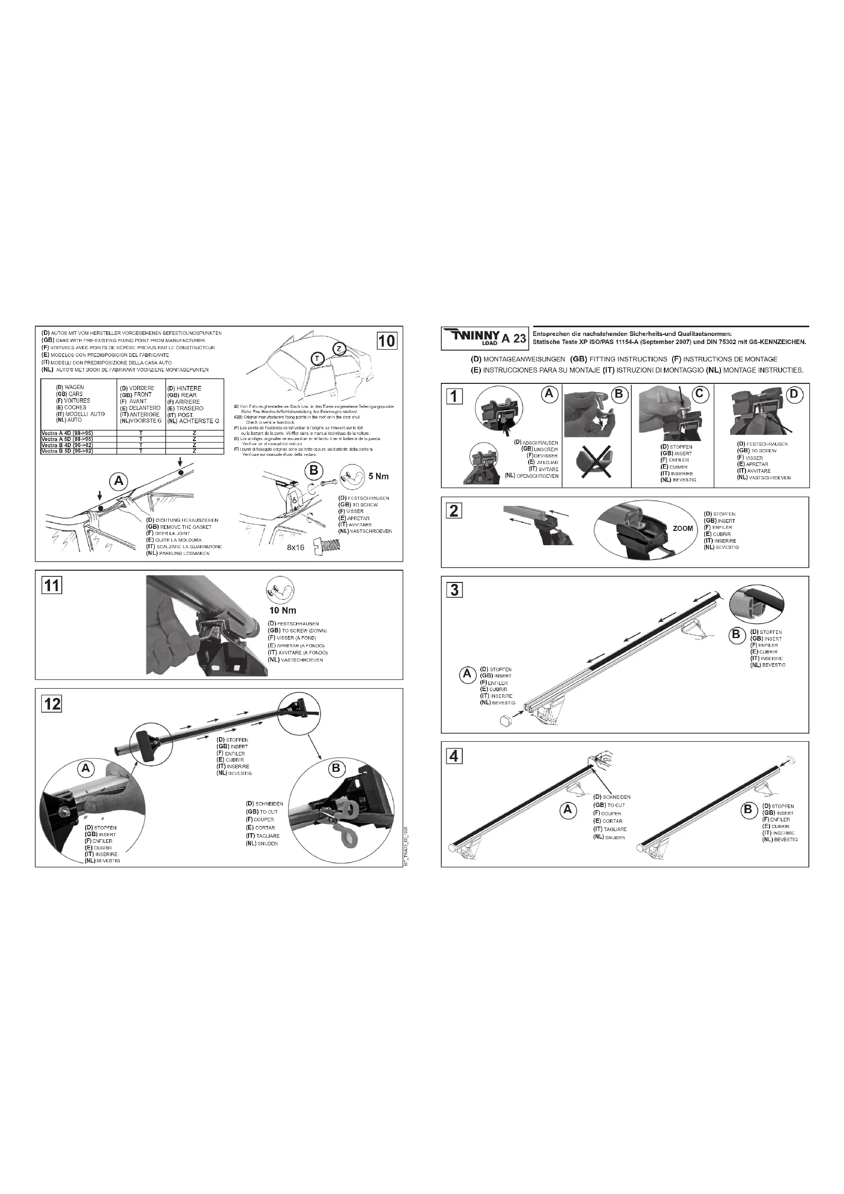 5 Nm (D) FESTSCHRAUSEN (GB) TO SCREW (F) VISSEER (E) APRETAR (IT) AVANTAGE (NL) VASTSCHROEVEN (A) D) DICHTUNG HERAUSZIEHEN (GB) REMOVE THE GASKET (F) OTER LA JOINT (E) QUITE LA MOLDBURA (IT) SCALZABE LA GUARNIZIONE (NL) PAVKUNG LOSMAKENMonter le porte-bagages, après quelques kilomètres, contrôler le serrage de toutes les vis.