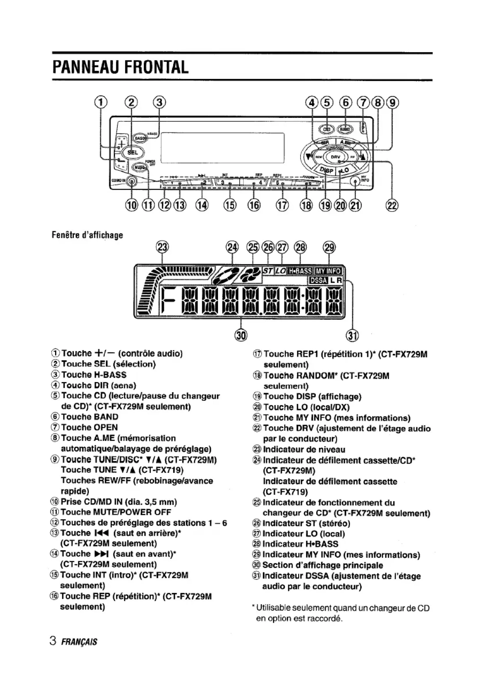 Touche RANDOM* (CT-FX729M seulement) @ Touche DISP (affichage) @ Touche LO (local/DX) @ Touche MY INFO (roes information) @ Touche DRV (ajustement de l’6tage audio par Ie conducteur) @ Indicateur de niveau @ Indicateur de defilement cassette/CD* (CT-FX729M) Indicateur de defilement cassette (CT-FX719) @ krdicateur de fonctionnement du changeur de CD* (CT-FX729M seulement) @ Indicateur ST (stereo) @lIndicateur LO (local) @ Indicateur H*BASS @ Indicateur MY INFO (roes information) @Section d’affichage principal @ Indicateur DSSA (ajustement de I’etage audio par Ie conducteur) *Utilizable seulement quand un changeur de CD en option est raccorde. 3 FRAiV~AISDETACHEMENTET