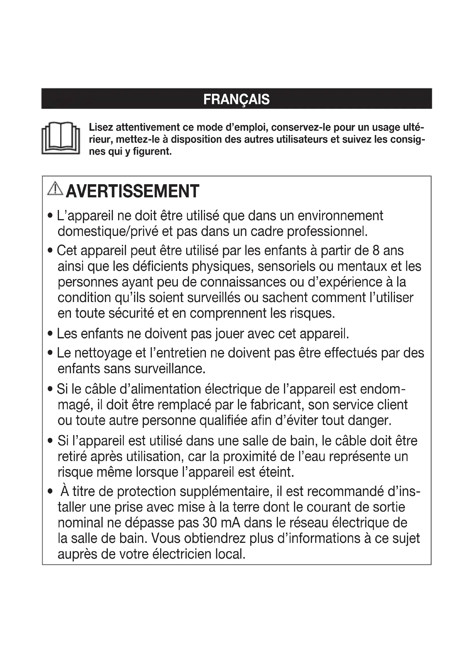 - Cet appareil peut être utilisé par les enfants à partir de 8ans ainsi que les déficients physiques, sensoriels ou mentaux et les personnes ayant peu de connaissances ou d’expérience à la condition qu’ils soient surveillés ou sachent comment l’utiliser en toute sécurité et en comprennent les risques.