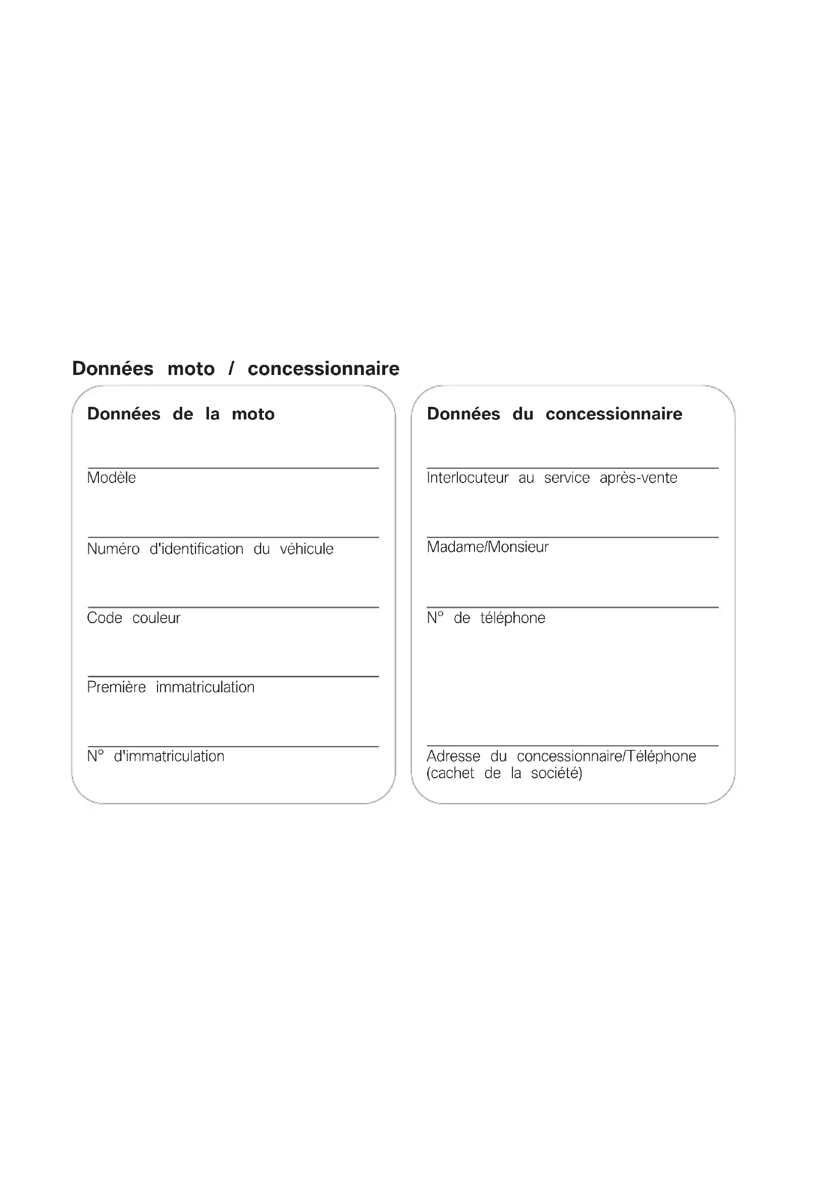 Livret de bord F 850 GS BMW MotorradDonnées moto / concessionnaire Données de la moto Modèle Numéro d'identification du véhicule Code couleur Première immatriculation N° d'immatriculation Données du concessionnaire Interlocuteur au service après-vente Madame/Monsieur N° de téléphone Adresse du concessionnaire/Téléphone (cachet de la société)Bienvenue dans le monde de BMW Nous vous félicitons d'avoir porté votre choix sur une moto BMW Motorrad et vous accueillons dans le cercle des pilotes BMW. Familiarisez-vous avec votre nouveau véhicule afin d'être en mesure de vous déplacer en toute sécurité sur les routes. À propos de ce livret de bord Veuillez prendre le temps de lire ce livret de bord avant de prendre la route avec votre nou- velle BMW. Vous y trouverez des indications importantes pour l'utilisation de votre véhicule qui vous aideront à exploiter pleine- ment les avantages techniques de votre BMW. Vous trouverez en outre des in- formations sur l'entretien et la maintenance de votre moto qui vous permettront d'en optimiser la fiabilité, la sécurité et la valeur de revente. La justification de l'exécution des travaux de maintenance est une condition préalable à toute pres- tation fournie à titre commercial. Si vous vendez un jour votre BMW, n'oubliez pas de remettre aussi le livret de bord. Il consti- tue un élément important de votre véhicule. Suggestions et critiques Votre concessionnaire BMW Motorrad se fera un plaisir de vous conseiller et de répondre à toutes les questions que vous pourrez lui poser sur votre véhicule. Nous vous souhaitons beaucoup de plaisir au guidon de votre BMW ainsi qu'un bon voyage en toute sécurité BMW Motorrad.