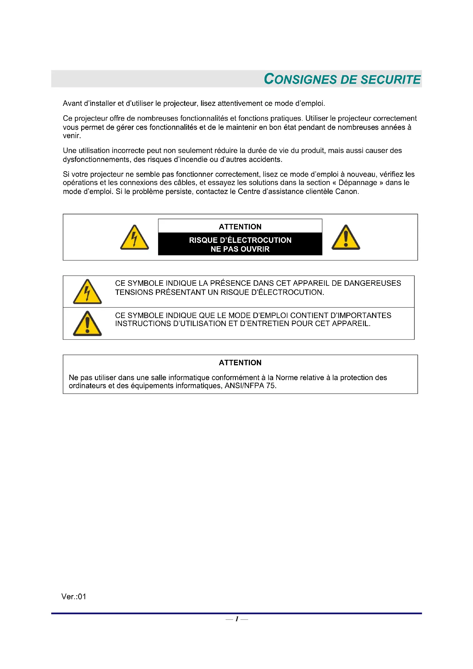 Lorsque vous suspendez le projecteur au plafond, nettoyez les entrées de ventilation et le haut du projecteur périodiquement avec un aspirateur. Si vous ne nettoyez pas le projecteur pendant une longue période, les ventilateurs de refroidissement peuvent être obstrués par la poussière, et cela peut causer une panne ou un sinistre. Assurez-vous de mettre en place des mesures antichute telles qu'un câble antichute en cas d'installation du projecteur dans des endroits élevés, par exemple, une installation au plafond. N’INSTALLEZ PAS LE PROJECTEUR DANS DES MILIEUX GRAS, HUMIDES OU ENFUMÉS, COMME UNE CUISINE POUR ÉVITER UNE PANNE OU UN SINISTRE. SI LE PROJECTEUR ENTRE EN CONTACT AVEC DE L’HUILE OU DES PRODUITS CHIMIQUES, IL PEUT ÊTRE ENDOMMAGÉ. LISEZ ET CONSERVEZ CE MANUEL POUR RÉFÉRENCE ULTÉRIEURE. Toutes les consignes de sécurité et doivent être lues avant de commencer à utiliser le produit. Lisez toutes les instructions données ici et conservez-les pour une utilisation ultérieure. Débranchez le projecteur de la prise secteur avant de le nettoyer. N’utilisez pas de produits d’entretien liquides ou en aérosol sur le projecteur. Utilisez un chiffon mouillé pour nettoyer. Conformez-vous aux consignes et avertissements indiqués sur ce projecteur. Pour une meilleure protection du projecteur pendant un orage, ou lorsqu’il est laissé sans surveillance ou inutilisé pendant de longues périodes de temps, débranchez-le de la prise murale. Cela permettra d’éviter les dommages dus à la foudre et aux surtensions. N’exposez pas cet appareil à la pluie ou n’utilisez pas près de l’eau, par exemple, dans un sous-sol humide, près d’une piscine, etc. N’utilisez pas d’accessoires non recommandés par le fabricant, car ils peuvent entraîner des risques.CKDO NOT OPEN– 3 – Ne posez pas ce projecteur sur un chariot, un support ou une table instable. Le projecteur peut tomber, causant des blessures graves à un enfant ou un adulte, et être gravement endommagé. Utilisez uniquement avec un charriot ou un pied recommandé par le fabricant ou vendu avec le projecteur. Pour un montage au mur ou sur une étagère, utilisez un outil comme un kit de montage pour sécuriser le projecteur. Un appareil sur un chariot doit être déplacé avec soin. Des arrêts soudains, une force excessive et des surfaces inégales peuvent conduire l’appareil et le chariot à se renverser. Les fentes et ouvertures à l’arrière et l’avant du boîtier sont prévues pour la ventilation, pour assurer le bon fonctionnement de l’appareil et le protéger de la surchauffe. Les ouvertures ne doivent jamais être couvertes avec un tissu ou d’autres matériaux, et l’ouverture du fond ne doit pas être obstruée en plaçant le projecteur sur un lit, un canapé, un tapis ou toute autre surface similaire. Ce projecteur ne doit jamais être placé à proximité ou au contact d’un radiateur ou d’une source de chaleur. Ce projecteur ne doit pas être placé dans une installation encastrée, comme une bibliothèque, à moins qu’une ventilation suffisante ne soit assurée. N’enfoncez jamais d’objets dans les fentes de ce projecteur car ils pourraient entrer en contact avec des points de voltage dangereux ou court-circuiter des éléments, d’où un risque d’incendie ou d’électrocution. Ne renversez jamais de liquide, quel qu’il soit, sur le projecteur. N’installez pas le projecteur à proximité des conduits de ventilation d’air conditionné. La source d’alimentation électrique du projecteur doit être conforme aux caractéristiques figurant sur l’étiquette d’identification. Si vous ne connaissez pas le type d’alimentation fournie, contactez le Centre d’assistance clientèle Canon ou votre compagnie d’électricité. Ne surchargez pas les prises murales et les rallonges car cela peut provoquer un incendie une électrocution. Ne placez aucun objet sur le cordon d’alimentation. Ne placez pas ce projecteur où le cordon peut être endommagé par des personnes marchant dessus. N’essayez pas de réparer par vous-même ce projecteur ; en l’ouvrant ou en enlevant le couvercle, vous vous exposez notamment à des risques d’électrocution. Confiez les opérations de réparation à un technicien qualifié. Débranchez le projecteur de la prise murale et adressez-vous au service après-vente dans les conditions suivantes : a. Quand le cordon ou la prise d’alimentation est endommagé ou dénudé. b. Si un liquide a été renversé sur le projecteur. c. Si le projecteur a été exposé à la pluie ou à de l’eau. d. Si le projecteur ne fonctionne pas correctement malgré le respect des consignes d’utilisation. Effectuez uniquement les réglages indiqués dans les consignes d’utilisation car d’autres réglages incorrects risquent de provoquer des dommages nécessitant l’intervention prolongée d’un technicien qualifié pour remettre le projecteur en état de fonctionnement normal. e. Si le projecteur est tombé ou le boîtier a été endommagé. f. Quand les performances du projecteur deviennent irrégulières, ce q ui indique la nécessité du recours au S.A.V. Lorsque des pièces de remplacement sont nécessaires, assurez-vous que le technicien utilise des pièces de remplacement spécifiées par le fabricant qui ont les mêmes caractéristiques que les pièces originales. Des substitutions non autorisées peuvent présenter un risque d’incendie, de choc électrique ou des blessures. À l’issue de tout entretien ou réparation à ce projecteur, demandez au technicien d’effectuer les contrôles de sécurité ordinaires pour déterminer si le projecteur est en parfait état de fonctionnement.— 4 — Cordon d’alimentation secteur Le cordon d’alimentation secteur fourni avec ce projecteur est conforme aux exigences d’utilisation dans le pays où vous l’avez acheté. Cordon d'alimentation CA pour les États-Unis et le Canada : Le 