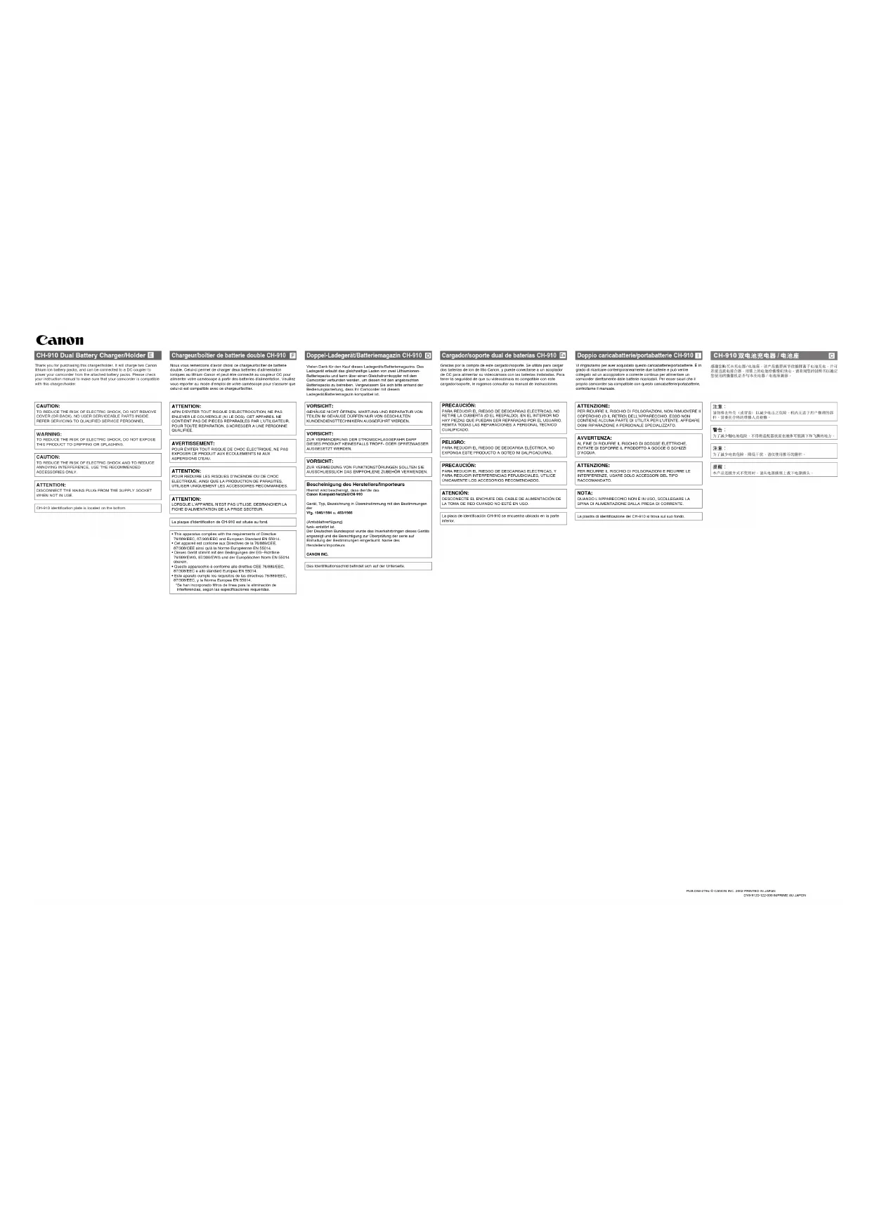 POUR ÉVITER TOUT RISQUE DE CHOC ÉLECTRIQUE, NE PAS EXPOSER CE PRODUIT AUX ÉCOULEMENTS NI AUX ASPERSIONS D’EAU. ATTENTION: POUR REDUIRE LES RISQUES D’INCENDIE OU DE CHOC ELECTRIQUE, AINSI QUE LA PRODUCTION DE PARASITES, UTILISER UNIQUEMENT LES ACCESSOIRES RECOMMANDES. ATTENTION: LORSQUE L’APPAREIL N’EST PAS UTILISE, DEBRANCHER LA FICHE D’ALIMENTATION DE LA PRISE SECTEUR. La plaque d’identification de CH-910 est située au fond. Nous vous remercions d’avoir choisi ce chargeur/boîtier de batterie double. Celui-ci permet de charger deux batteries d’alimentation ioniques au lithium Canon et peut être connecté au coupleur CC pour alimenter votre caméscope à partir des batteries d’alimentation. Veuillez vous reporter au mode d’emploi de votre caméscope pour s’assurer que celui-ci est compatible avec ce chargeur/boîtier.