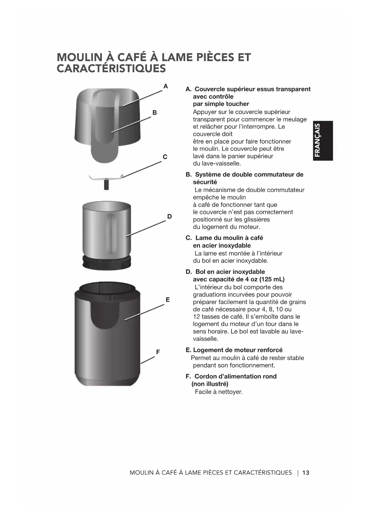 - Garder les mains et les ustensiles à l'ecart des lames lors du hachage d'aliments pour réduire les risques de blessure grave ou d'endommager la lame du moulin à café. On peut utiliser un gratoir seulement lorsque le moulin à café ne fonctionne pas.