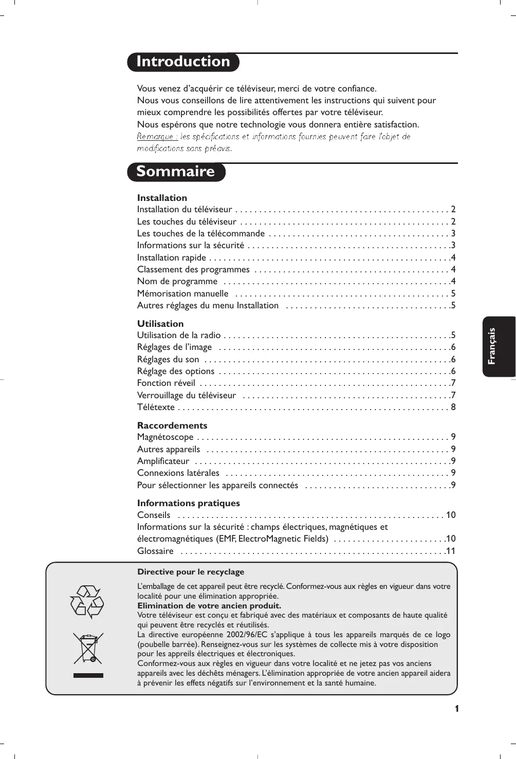 Conseils Mauvaise réception La proximité de montagnes ou de hauts immeubles peut être la cause d'image dédoublée, d'écho ou d'ombres. Dans ce cas, essayez d’ajuster manuellement l’accord de l’image: voir Ajust. Fin (p. 5) ou modifiez l'orientation de l'antenne extérieure. Vérifiez également que votre antenne permet de recevoir les émissions dans cette bande de fréquences (bande UHF ou VHF) ? En cas de réception difficile (image neigeuse), positionnez le réglage Reduct. Bruit du menu Options sur Marche (p. 6). Absence d'image Si le téléviseur ne s’allume pas, appuyez 2 fois sur la touche b située sur la télécommande. Avez-vous bien branché l'antenne ? Avez-vous choisi le bon système ? (p. 5) Le contraste ou la lumière est déréglé ? Appuyez sur la touche ≈ et reprenez les réglages du menu Image. Une prise péritel ou une prise d'antenne mal connectée est souvent la cause de problèmes d'image ou de son (il arrive que les prises se déconnectent légèrement lorsque l'on déplace ou que l'on tourne le téléviseur).Vérifiez toutes les connexions. L’équipement périphérique délivre une image en noir et blanc Vous n’avez pas sélectionné la bonne prise avec la touche n : S-VHS2 au lieu de EXT2. Pour la lecture d’une cassette vidéo, vérifiez qu’elle est enregistré au même standard (PAL, SECAM, NTSC) que ce que peut lire le magnétoscope. Absence de son Si certains programmes sont dépourvus de son, mais pas d’image, c’est que vous n’avez pas le bon système TV. Modifiez le réglage Système (p. 5). Télétexte Certains caractères ne s’affichent pas correctement ? Vérifiez que le réglage du pays est correctement positionné (p. 5). La télécommande ne fonctionne plus ? Le voyant du téléviseur ne clignote plus lorsque vous utilisez la télécommande ? Remplacez les piles. Veille Lorsque vous allumez le téléviseur, il reste en veille et l’indication Verrouillé s'affiche dès que vous utilisez les touches du téléviseur ? La fonction Verrou enfant est en service (p. 7). Si le téléviseur ne reçoit pas de signal pendant 15 mn, il passe automatiquement en veille. En mode veille, votre TV consomme moins de 5W selon les modèles.Afin d’économiser l’énergie, utilisez la touche marche/arrêt pour éteindre complètement l’appareil. Toujours pas de résultats ? En cas de panne, n’essayez jamais de réparer vous même le téléviseur, mais consultez le service après vente. Nettoyage du téléviseur Le nettoyage de l’écran et du coffret doit être effectué uniquement avec un chiffon propre, doux et non pelucheux. Ne pas utiliser de produit à base d’alcool ou de solvant. Informations sur la sécurité : champs électriques, magnétiques et électromagnétiques (EMF, ElectroMagnetic Fields)