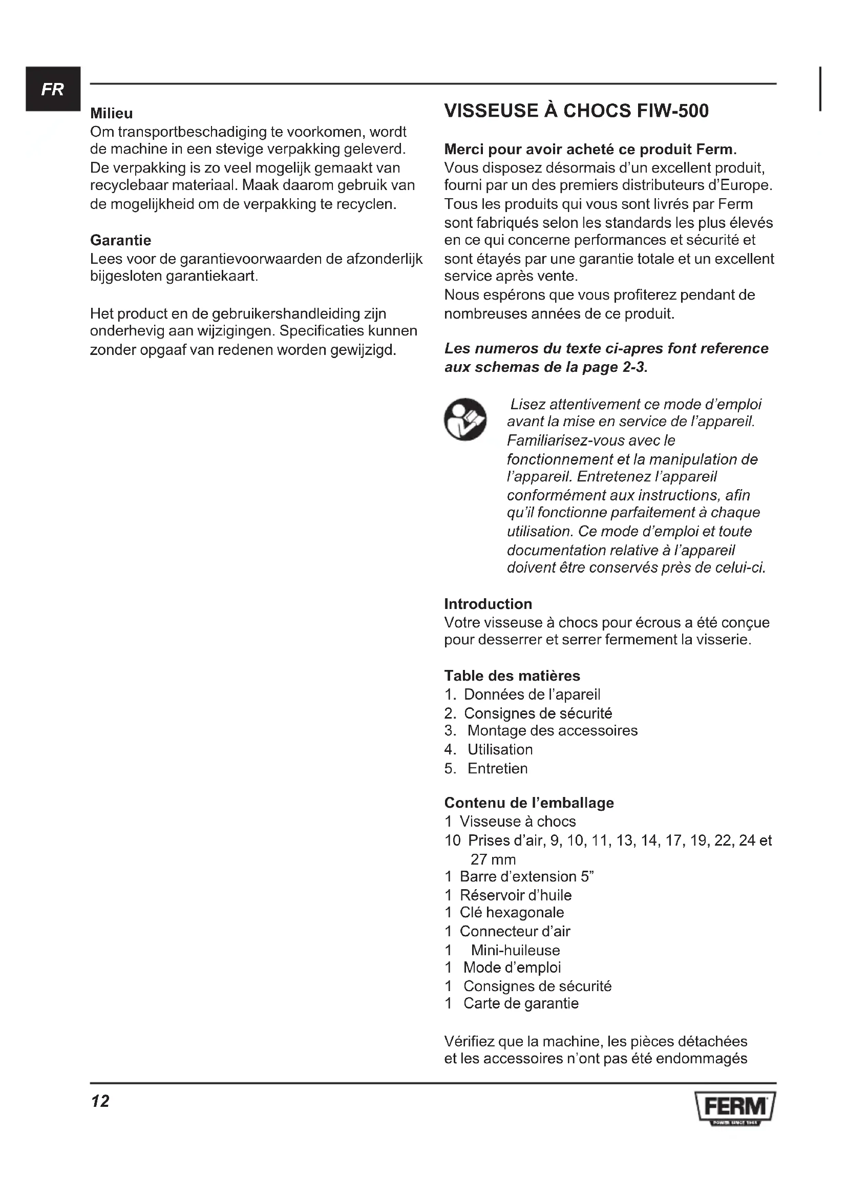 Milieu Om transportbeschadiging te voorkomen, wordt de machine in een stevige verpakking geleverd. De verpakking is zo veel mogelijk gemaakt van recyclebaar materiaal. Maak daarom gebruik van de mogelijkheid om de verpakking te recyclen. Garantie Lees voor de garantievoorwaarden de afzonderlijk bijgesloten garantiekaart. Het product en de gebruikershandleiding zijn onderhevig aan wijzigingen. Specificaties kunnen zonder opgaaf van redenen worden gewijzigd. VISSEUSE à CHOCS FIW-500 Merci pour avoir acheté ce produit Ferm. Vous disposez désormais d’un excellent produit, fourni par un des premiers distributeurs d’Europe. Tous les produits qui vous sont livrés par Ferm sont fabriqués selon les standards les plus élevés en ce qui concerne performances et sécurité et sont étayés par une garantie totale et un excellent service après vente. Nous espérons que vous profiterez pendant de nombreuses années de ce produit. Les numeros du texte ci-apres font reference aux schemas de la page 2-3. Lisez attentivement ce mode d’emploi avant la mise en service de l’appareil. Familiarisez-vous avec le fonctionnement et la manipulation de l’appareil. Entretenez l’appareil conformément aux instructions, afin qu’il fonctionne parfaitement à chaque utilisation. Ce mode d’emploi et toute documentation relative à l’appareil doivent être conservés près de celui-ci. Introduction Votre visseuse à chocs pour écrous a été conçue pour desserrer et serrer fermement la visserie. Table des matières