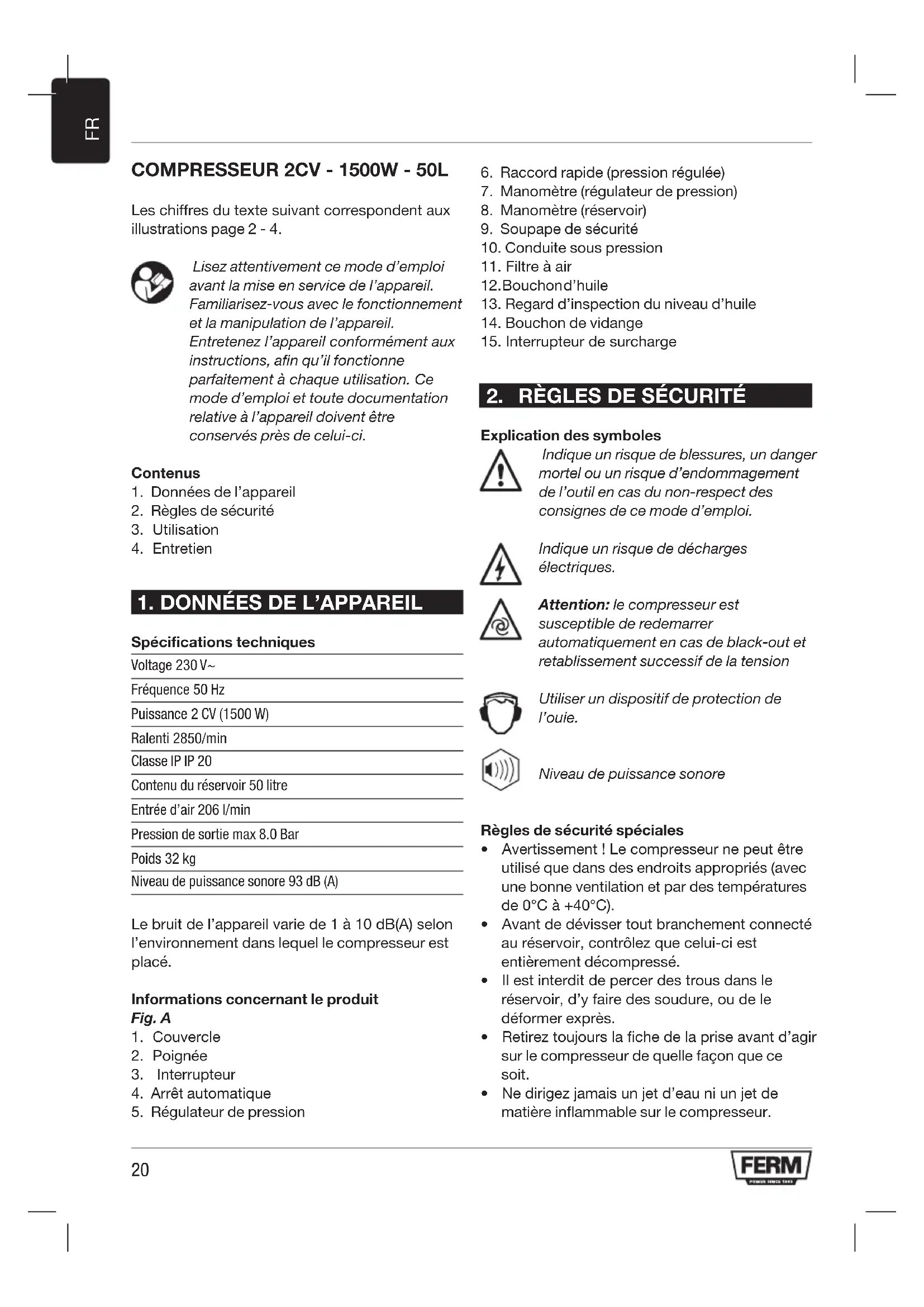 Spécifications techniques Voltage 230 V~ Fréquence 50 Hz Puissance 2 CV (1500 W) Ralenti 2850/min Classe IP IP 20 Contenu du réservoir 50 litre Entrée d’air 206 l/min Pression de sortie max 8.0 Bar Poids 32 kg Niveau de puissance sonore 93 dB (A) Lebruitdel’appareilvariede1à10dB(A)selon l’environnement dans lequel le compresseur est placé. Informations concernant le produit Fig. A
