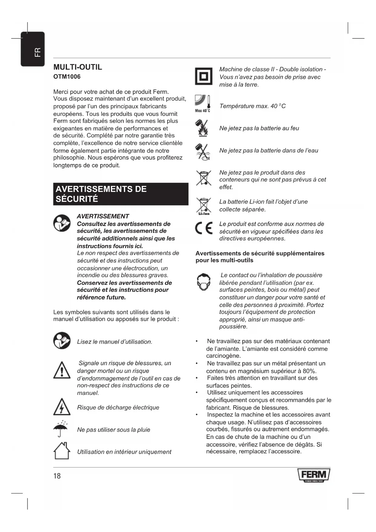 NLMULTI-OUTIL OTM1006 MercipourvotreachatdeceproduitFerm. Vousdisposezmaintenantd’unexcellentproduit, proposéparl’undesprincipauxfabricants européens.Touslesproduitsquevousfournit Fermsontfabriquésselonlesnormeslesplus exigeantesenmatièredeperformanceset desécurité.Complétéparnotregarantietrès complète,l’excellencedenotreserviceclientèle formeégalementpartieintégrantedenotre philosophie.Nousespéronsquevousprofiterez longtempsdeceproduit. AVERTISSEMENTS DE SÉCURITÉ AVERTISSEMENT Consultez les avertissements de sécurité, les avertissements de sécurité additionnels ainsi que les instructions fournis ici. Le non respect des avertissements de sécurité et des instructions peut occasionner une électrocution, un incendie ou des blessures graves. Conservez les avertissements de sécurité et les instructions pour référence future. Lessymbolessuivantssontutilisésdansle manueld’utilisationouapposéssurleproduit: Lisez le manuel d’utilisation. Signale un risque de blessures, un danger mortel ou un risque d’endommagement de l’outil en cas de non-respect des instructions de ce manuel. Risque de décharge électrique Ne pas utiliser sous la pluie Utilisation en intérieur uniquement Machine de classe II - Double isolation - Vous n’avez pas besoin de prise avec mise à la terre. Température max. 40