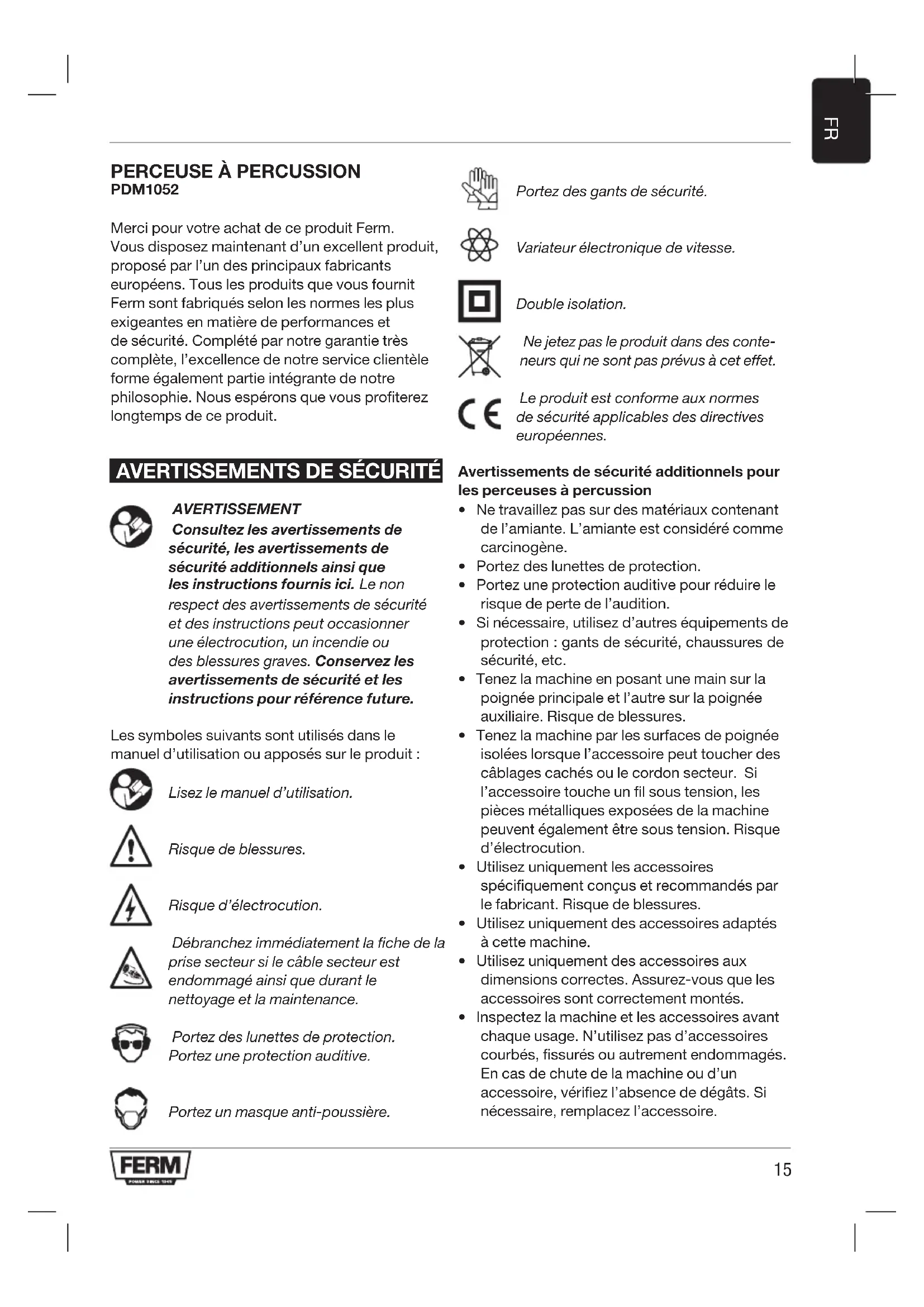 PERCEUSE À PERCUSSION PDM1052 Merci pour votre achat de ce produit Ferm. Vous disposez maintenant d’un excellent produit, proposé par l’un des principaux fabricants européens. Tous les produits que vous fournit Ferm sont fabriqués selon les normes les plus exigeantes en matière de performances et de sécurité. Complété par notre garantie très complète, l’excellence de notre service clientèle forme également partie intégrante de notre philosophie. Nous espérons que vous profiterez longtemps de ce produit.
