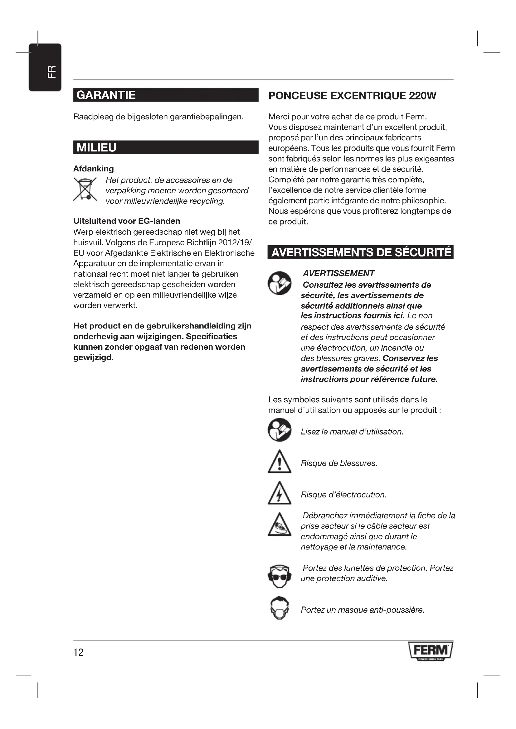 Merci pour votre achat de ce produit Ferm. Vous disposez maintenant d’un excellent produit, proposé par l’un des principaux fabricants européens. Tous les produits que vous fournit Ferm sont fabriqués selon les normes les plus exigeantes en matière de performances et de sécurité. Complété par notre garantie très complète, l’excellence de notre service clientèle forme également partie intégrante de notre philosophie. Nous espérons que vous profiterez longtemps de ce produit.