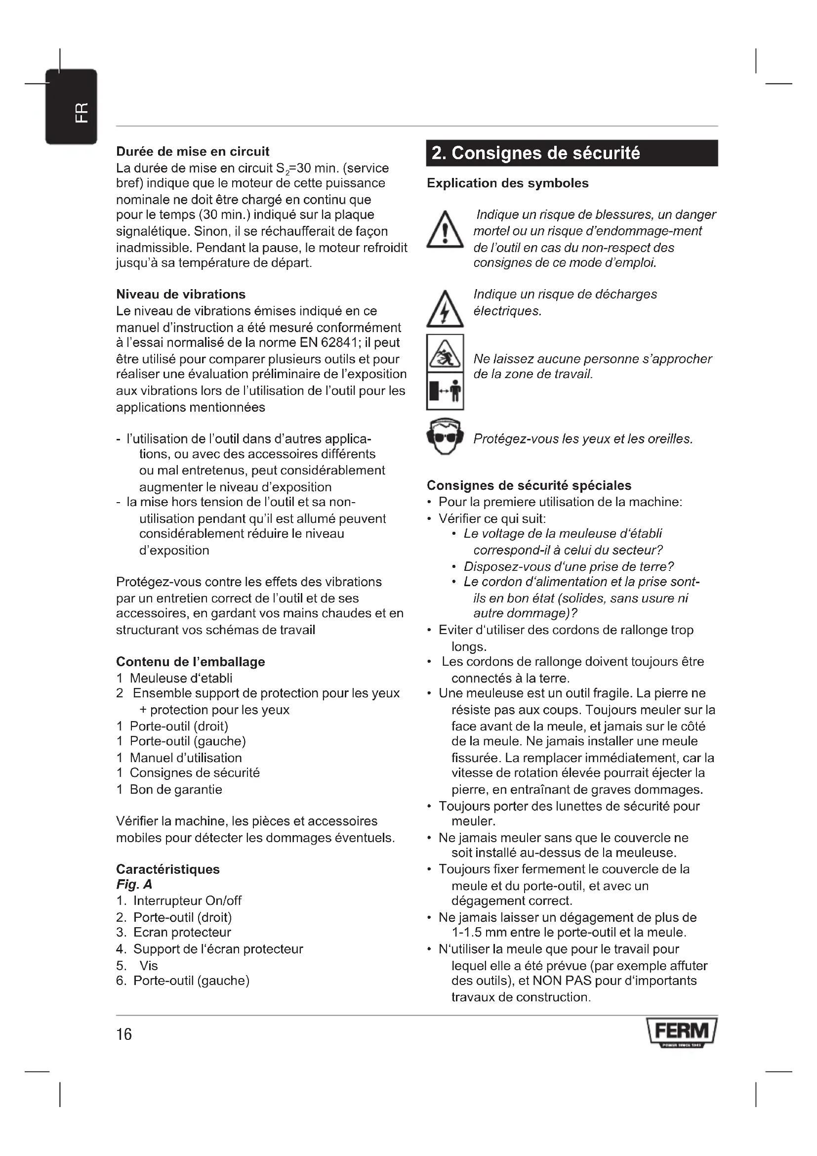 =30 min. (service bref) indique que le moteur de cette puissance nominale ne doit être chargé en continu que pour le temps (30 min.) indiqué sur la plaque signalétique. Sinon, il se réchaufferait de façon inadmissible. Pendant la pause, le moteur refroidit jusqu’à sa température de départ. Niveau de vibrations Le niveau de vibrations émises indiqué en ce manuel d’instruction a été mesuré conformément à l’essai normalisé de la norme EN 62841; il peut être utilisé pour comparer plusieurs outils et pour réaliser une évaluation préliminaire de l’exposition aux vibrations lors de l’utilisation de l’outil pour les applications mentionnées - l’utilisation de l’outil dans d’autres applica- tions, ou avec des accessoires différents ou mal entretenus, peut considérablement augmenter le niveau d’exposition - la mise hors tension de l’outil et sa non- utilisation pendant qu’il est allumé peuvent considérablement réduire le niveau d’exposition Protégez-vous contre les effets des vibrations par un entretien correct de l’outil et de ses accessoires, en gardant vos mains chaudes et en structurant vos schémas de travail Contenu de l’emballage 1 Meuleuse d‘etabli 2 Ensemble support de protection pour les yeux + protection pour les yeux 1 Porte-outil (droit) 1 Porte-outil (gauche) 1 Manuel d’utilisation 1 Consignes de sécurité 1 Bon de garantie Vérifier la machine, les pièces et accessoires mobiles pour détecter les dommages éventuels. Caractéristiques Fig. A