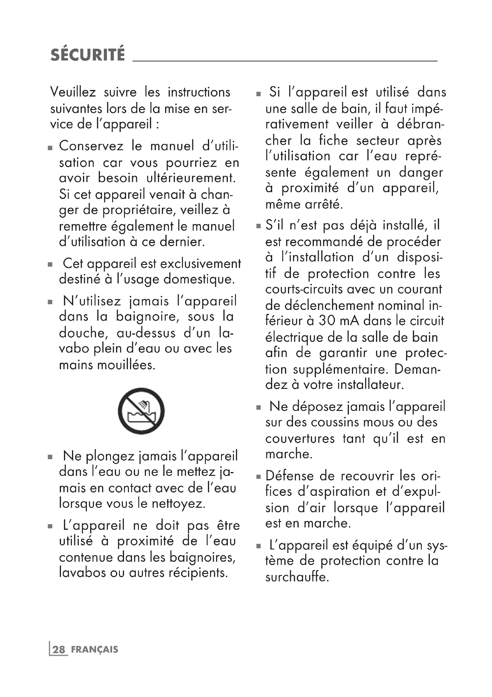 L’appareil ne doit pas être utilisé à proximité de l’eau contenue dans les baignoires, lavabos ou autres récipients.