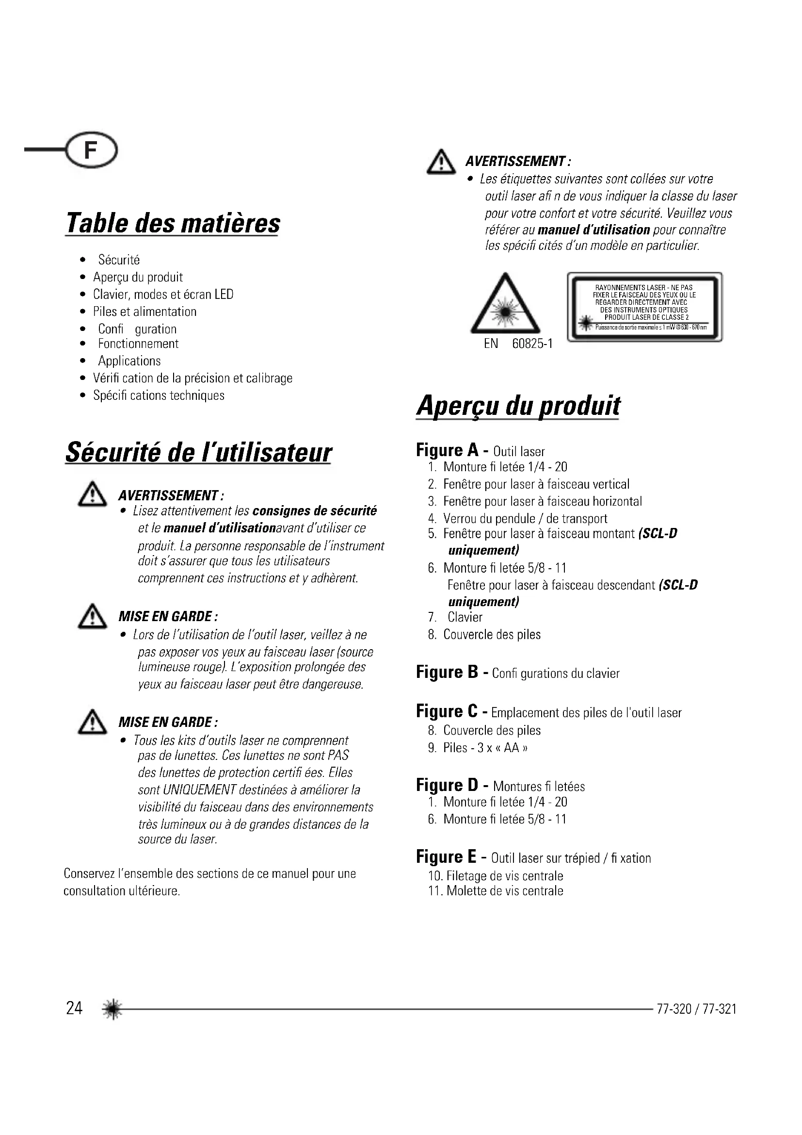 - Les étiquettes suivantes sont collées sur votre outil laser afi n de vous indiquer la classe du laser pour votre confort et votre sécurité. Veuillez vous référer au manuel d’utilisation pour connaître les spécifi cités d’un modèle en particulier. F25 77-320 / 77-321 FigureF - Positions du verrou du pendule/ de transport FigureG - Modes laser FigureH - Mode impulsions FigureJ - Mode manuel FigureK - Précision du faisceau de niveau FigureL - Précision du faisceau horizontal FigureM - Précision du faisceau vertical FigureN - Précision du faisceau montant et descendant Clavier, modes et écran LED Claviers (Voir fi gure