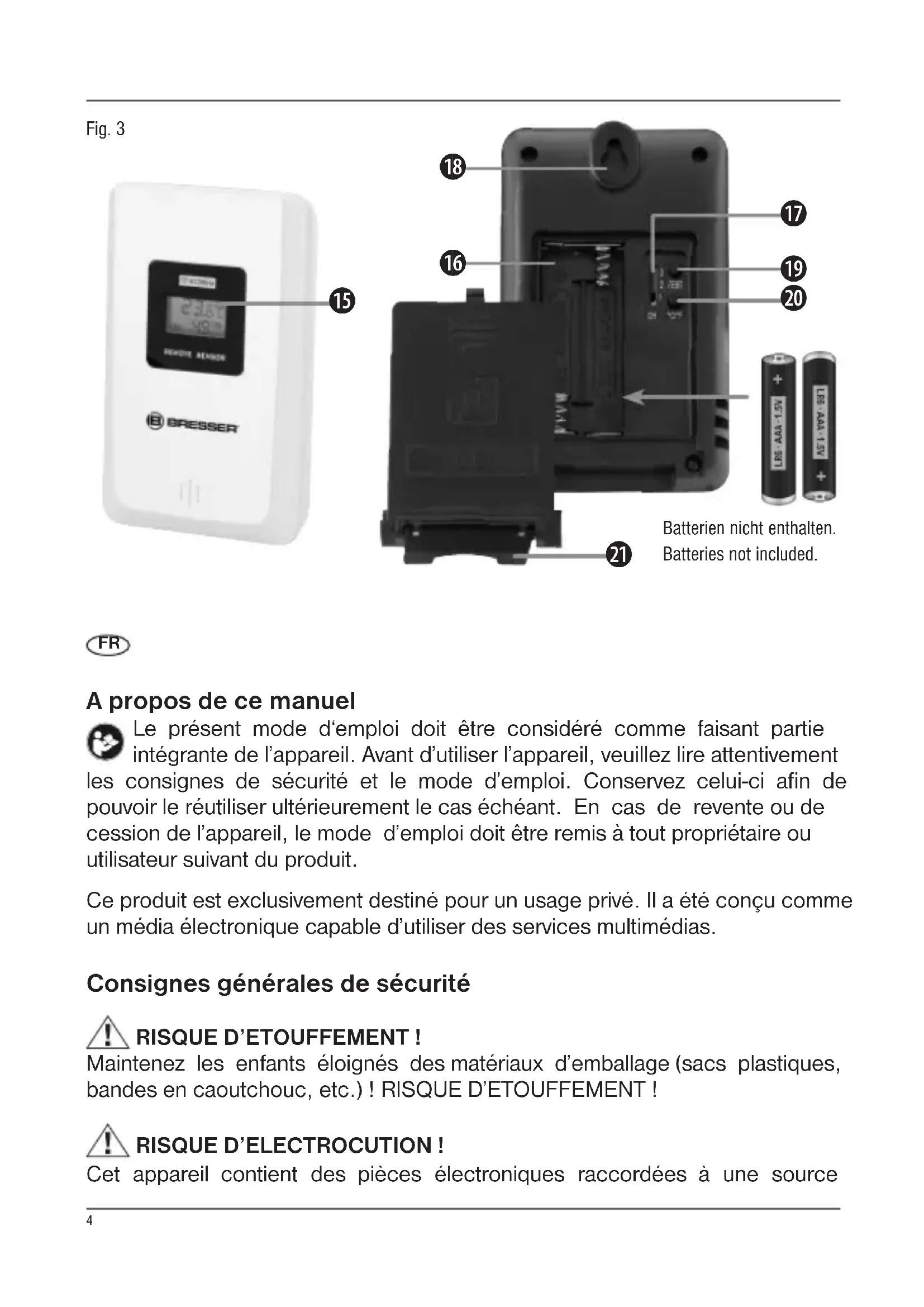 Fig. 3 Batterien nicht enthalten. Batteries not included.5 d’alimentation électrique (batteries). Ne jamais laisser les enfants manipuler l’appareil sans surveillance ! L’utilisation de l’appareil doit se faire exclusivement comme décrit dans ce manuel, faute de quoi un RISQUE d’ELECTROCUTION peut exister ! RISQUE DE BLESSURE ! L’écoulement de l‘électrolyte d’une batterie peut entraîner des blessures par brûlure due à l’acidité du produit ! Evitez tout contact de l’électrolyte avec la peau, les yeux et les muqueuses. En cas de contact avec l‘acide, rincez abondamment et immédiatement les parties du corps concernées en utilisant de l’eau claire et consultez un médecin dans les meilleurs délais. RISQUE D’EXPLOSION / D’INCENDIE ! N’utilisez que les batteries conseillées. L’appareil et les batteries ne doivent pas être court-circuitées ou jeter dans le feu ! Toute surchauffe ou manipulation inappropriée peut déclencher courts-circuits, incendies voire conduire à des explosions ! REMARQUE ! Ne pas démonter l’appareil ! En cas de défaut, veuillez vous adresser à votre revendeur spécialisé. Celui-ci prendra contact avec le service client pour, éventuellement, envoyer l’appareil en réparation. Ne plongez jamais l’appareil dans de l’eau. N’exposez jamais l’appareil à des coups ou à des chocs importants, à la poussière, à des températures élevées constantes ou à de l’humidité extrême. Cela pourrait entrainer des dysfonctionnements, des courts-circuits ou endommager les piles ou les composants. N‘utilisez que les batteries conseillées. Remplacez toujours les batteries trop faibles ou usées par un jeu complet de nouvelles batteries disposant de toute sa capacité. N’utilisez pas de batteries de marques, de types ou de capacités différentes. Les batteries doivent être enlevées de l’appareil lorsque celui-ci est destiné à ne pas être utiliser pendant un certain temps ! Le fabricant récuse toute responsabilité en cas de dommage résultant d’une alimentation électrique inappropriée due à des batteries mal insérées! VOLUME DE LIVRAISON (Fig. 1) Station de base (A), capteur extérieur (C), mode d’emploi Garantie / Warranty6