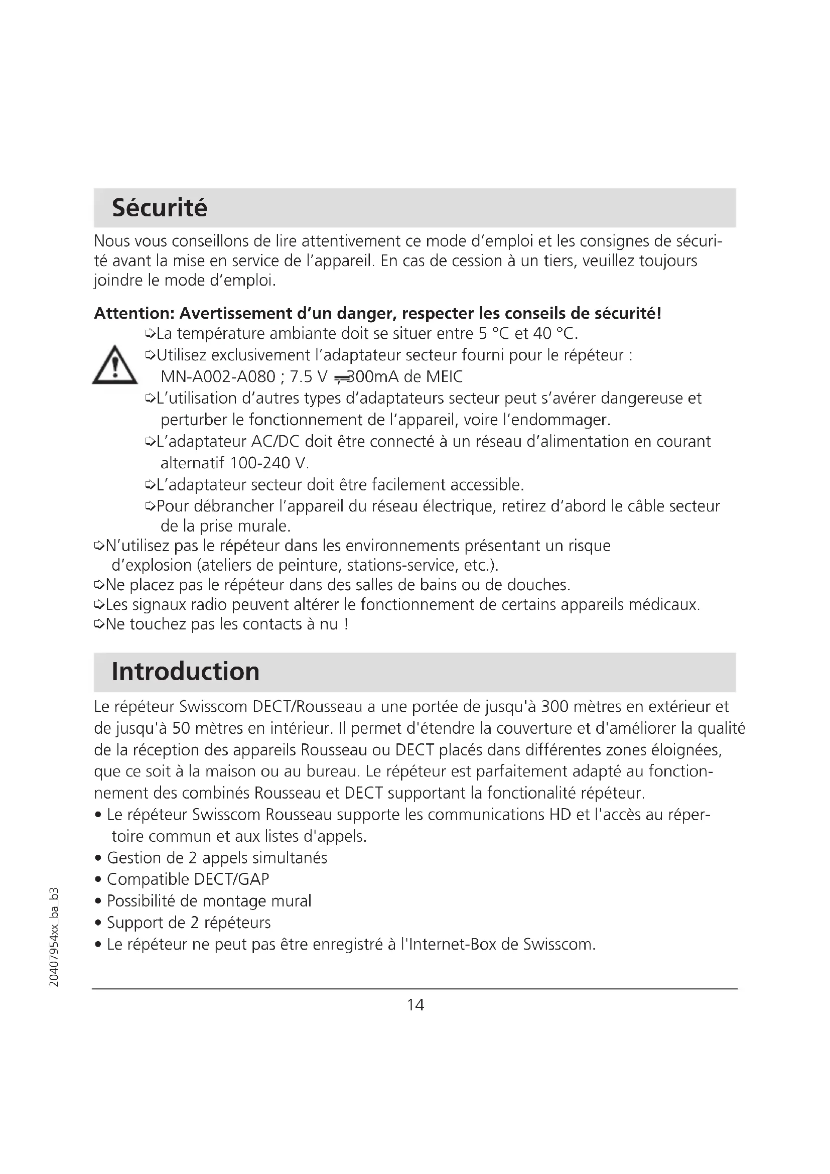 20407954xx_ba_b3 Guide de démarrage rapide ………………………………………………………………12 Bref aperçu du répéteur Swisscom ………………………………………………………12 Voyant de contrôle ……………………………………………………………………………12 Sécurité ………………………………………………………………………………………14 Introduction …………………………………………………………………………………14 Mise en service………………………………………………………………………………15 Matériel livré …………………………………………………………………………………15 Déclaration rapide ……………………………………………………………………………15 Déclaration à une autre base…………………………………………………………………16 Limitations ……………………………………………………………………………………16 Installation ……………………………………………………………………………………16 Systéme avec plusieurs répéteurs ………………………………………………………17 Déclaration de plusieurs répéteurs …………………………………………………………17 Systéme avec plusieurs répéteurs : configuration en étoile ………………………………17 Systéme avec plusieurs répéteurs : configuration en série…………………………………19 Montage mural………………………………………………………………………………20 Aide à la recherche d’erreurs ……………………………………………………………20 Informations importantes …………………………………………………………………21 Entretien ………………………………………………………………………………………21 Recyclage (Respect de l'environnement) ……………………………………………………21 Homologation et conformité…………………………………………………………………21 Label CE ………………………………………………………………………………………22 Garantie et support …………………………………………………………………………22 Aide ……………………………………………………………………………………………22 Sommaire14 20407954xx_ba_b3 Sécurité Nous vous conseillons de lire attentivement ce mode d’emploi et les consignes de sécuri- té avant la mise en service de l’appareil. En cas de cession à un tiers, veuillez toujours joindre le mode d’emploi. Attention: Avertissement d’un danger, respecter les conseils de sécurité! ➭ La température ambiante doit se situer entre 5 °C et 40 °C. ➭ Utilisez exclusivement l’adaptateur secteur fourni pour le répéteur : MN-A002-A080 ; 7.5 V , 300mA de MEIC ➭ L’utilisation d’autres types d’adaptateurs secteur peut s’avérer dangereuse et perturber le fonctionnement de l’appareil, voire l’endommager. ➭ L’adaptateur AC/DC doit être connecté à un réseau d’alimentation en courant alternatif 100-240 V. ➭ L’adaptateur secteur doit être facilement accessible. ➭ Pour débrancher l’appareil du réseau électrique, retirez d’abord le câble secteur de la prise murale. ➭ N’utilisez pas le répéteur dans les environnements présentant un risque d’explosion (ateliers de peinture, stations-service, etc.). ➭ Ne placez pas le répéteur dans des salles de bains ou de douches. ➭ Les signaux radio peuvent altérer le fonctionnement de certains appareils médicaux. ➭ Ne touchez pas les contacts à nu ! Introduction Le répéteur Swisscom DECT/Rousseau a une portée de jusqu'à 300 mètres en extérieur et de jusqu'à 50 mètres en intérieur. Il permet d'étendre la couverture et d'améliorer la qualité de la réception des appareils Rousseau ou DECT placés dans différentes zones éloignées, que ce soit à la maison ou au bureau. Le répéteur est parfaitement adapté au fonction- nement des combinés Rousseau et DECT supportant la fonctionalité répéteur.