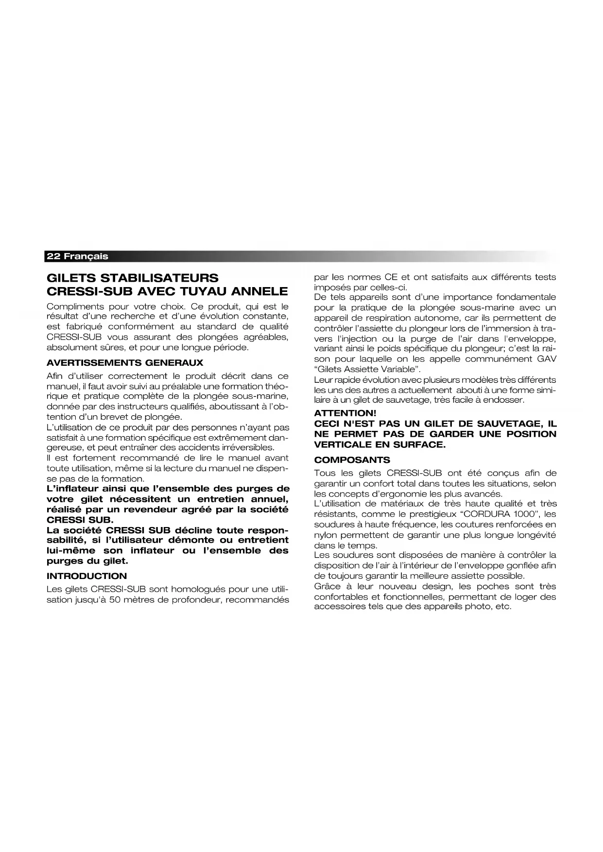 Compliments pour votre choix. Ce produit, qui est le résultat d’une recherche et d’une évolution constante, est fabriqué conformément au standard de qualité CRESSI-SUB vous assurant des plongées agréables, absolument sûres, et pour une longue période. AVERTISSEMENTS GENERAUX Afin d’utiliser correctement le produit décrit dans ce manuel, il faut avoir suivi au préalable une formation théo- rique et pratique complète de la plongée sous-marine, donnée par des instructeurs qualifiés, aboutissant à l’ob- tention d’un brevet de plongée. L’utilisation de ce produit par des personnes n’ayant pas satisfait à une formation spécifique est extrêmement dan- gereuse, et peut entraîner des accidents irréversibles. Il est fortement recommandé de lire le manuel avant toute utilisation, même si la lecture du manuel ne dispen- se pas de la formation. L’inflateur ainsi que l’ensemble des purges de votre gilet nécessitent un entretien annuel, réalisé par un revendeur agréé par la société CRESSI SUB. La société CRESSI SUB décline toute respon- sabilité, si l’utilisateur démonte ou entretient lui-même son inflateur ou l’ensemble des purges du gilet. INTRODUCTION Les gilets CRESSI-SUB sont homologués pour une utili- sation jusqu'à 50 mètres de profondeur, recommandés par les normes CE et ont satisfaits aux différents tests imposés par celles-ci. De tels appareils sont d’une importance fondamentale pour la pratique de la plongée sous-marine avec un appareil de respiration autonome, car ils permettent de contrôler l’assiette du plongeur lors de l’immersion à tra- vers l'injection ou la purge de l’air dans l'enveloppe, variant ainsi le poids spécifique du plongeur; c’est la rai- son pour laquelle on les appelle communément GAV “Gilets Assiette Variable”. Leur rapide évolution avec plusieurs modèles très différents les uns des autres a actuellement abouti à une forme simi- laire à un gilet de sauvetage, très facile à endosser. ATTENTION! CECI N'EST PAS UN GILET DE SAUVETAGE, IL NE PERMET PAS DE GARDER UNE POSITION VERTICALE EN SURFACE. COMPOSANTS Tous les gilets CRESSI-SUB ont été conçus afin de garantir un confort total dans toutes les situations, selon les concepts d’ergonomie les plus avancés. L’utilisation de matériaux de très haute qualité et très résistants, comme le prestigieux “CORDURA 1000”, les soudures à haute fréquence, les coutures renforcées en nylon permettent de garantir une plus longue longévité dans le temps. Les soudures sont disposées de manière à contrôler la disposition de l’air à l’intérieur de l’enveloppe gonflée afin de toujours garantir la meilleure assiette possible. Grâce à leur nouveau design, les poches sont très confortables et fonctionnelles, permettant de loger des accessoires tels que des appareils photo, etc. Libretto 25/10/05 25-10-2005 12:53 Pagina 2223Français Tous les gilets sont équipés de poches porte-lest laté- rales spéciales qui, en cas d'urgence, permettent une rapide expulsion du lestage. Les systèmes utilisés sont, suivant les modèles, soit à gravité (sortie automatique du lest après décrochage manuel de la boucle de sécurité) soit "C-Trim System" (expulsion manuelle de la poche porte-lest spéciale). D'autres avantages sont associés au design particulier de l’enveloppe, permettant une disposition rationnelle de tous les instruments utilisés lors de la plongée (octopus, manomètre, torches, boussole, etc.). BACK-PACK Sa fonction principale est d’assurer un assemblage cor- rect entre la bouteille et le stab, et donc entre le stab et l’utilisateur. On peut ainsi mieux comprendre l’importance d'un back- pack d'un point de vue ergonomique: une forme correc- te est le point de départ d’un GAV confortable. De longues études et plusieurs essais dans les labora- toires CRESSI-SUB ont permis de créer un back-pack de conception moderne, permettant le réglage vertical du support lombaire, afin de l’adapter à tous types d’utilisa- teurs. La poignée, elle-aussi conçue avec un nouveau design, a été redimensionnée afin de pouvoir transporter aisément le gilet dans toutes les situations. On peut éga- lement utiliser une seconde sangle de fixation sur la bou- teille (achetée séparément) et l’on peut fixer la bouteille sur deux positions différentes. INFLATEUR Le véritable coeur du stab, il permet d’augmenter ou de diminuer le volume d’air à l’intérieur de l’enveloppe. On comprend donc l'importance de ce groupe, composé du Fenstop, d’un tuyau annelé, et de la soupape de purge. Dessiné grâce à des technologies modernes, il possède un design sophistiqué et agressif, s'intégrant de manière harmonieuse avec les autres composants du GAV. Voyons en détail les caractéristiques particu- lières de chaque composant. FENSTOP Il permet de commander le gonflage ou l’évacuation contrôlé de l’air dans l’enveloppe. Extrêmement compli- qué d'un point de vue mécanique, il a été énormément simplifié grâce à la technicité CRESSI-SUB en utilisant des matériaux plastiques de la dernière génération. Les figures suivantes montrent l'entretien qui, pour des raisons de sécurité, doit être effectué exclusivement par du personnel technique autorisé par CRESSI-SUB. LA SOCIÉTÉ CRESSI SUB DÉCLINE TOUTE