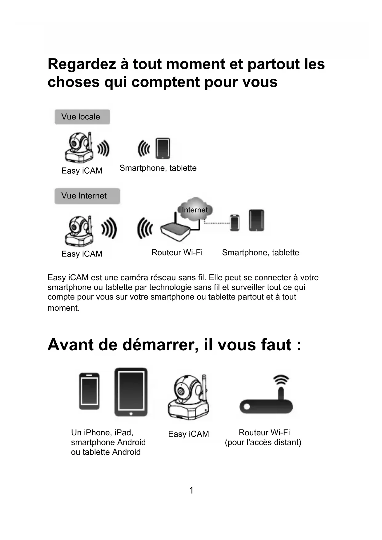 Easy-iCAM est une camera réseau sans fil. Elle peut se connecter directement à votre smartphone ou tablette sans fil, et vous pouvez voir les flux video sur votre smartphone ou tablette en mode vue locale. En mode vue Internet, votre smartphone ou tablette doit acceder à laamera via un routeur Wi-Fi ou réseau mobile 3G/4G, puis vous pouvez acceder à un flux en direct de video et d'audio sur votre smartphone ou tablette à tout endroit dans le monde.