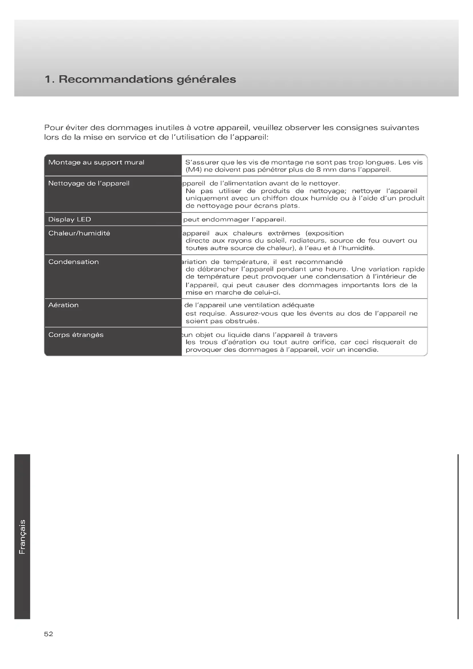 | Nettoyage de l'appareil | pareil de l'alimentation avant de le nettoyer.Ne pas utiliser de produits de nettoyage; nettoyer l'appareil uniquement avec un chiffon doux humide ou à l'aide d'un produit de nettoyage pour écrans plats. |