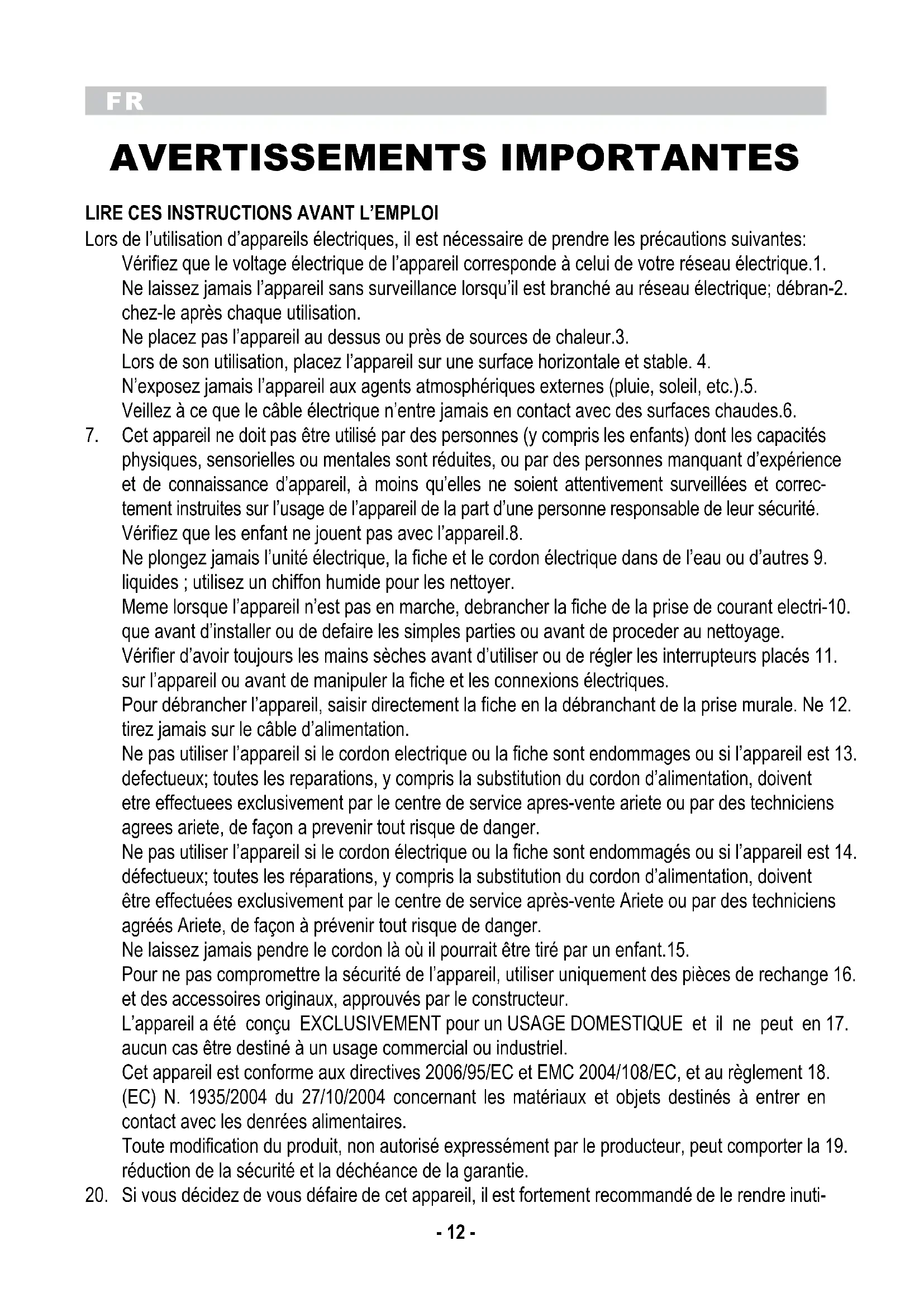Ne pas utiliser l'appareil si le cordon électrique ou la fiche sont endommagés ou si l'appareil est 14. défectueux; toutes les réparations, y compris la substitution du cordon d'alimentation, doivent être effectuées exclusivement par le centre de service après-vente Ariete ou par des techniciens agrées Ariete, de façon à prévenir tout risque de danger.