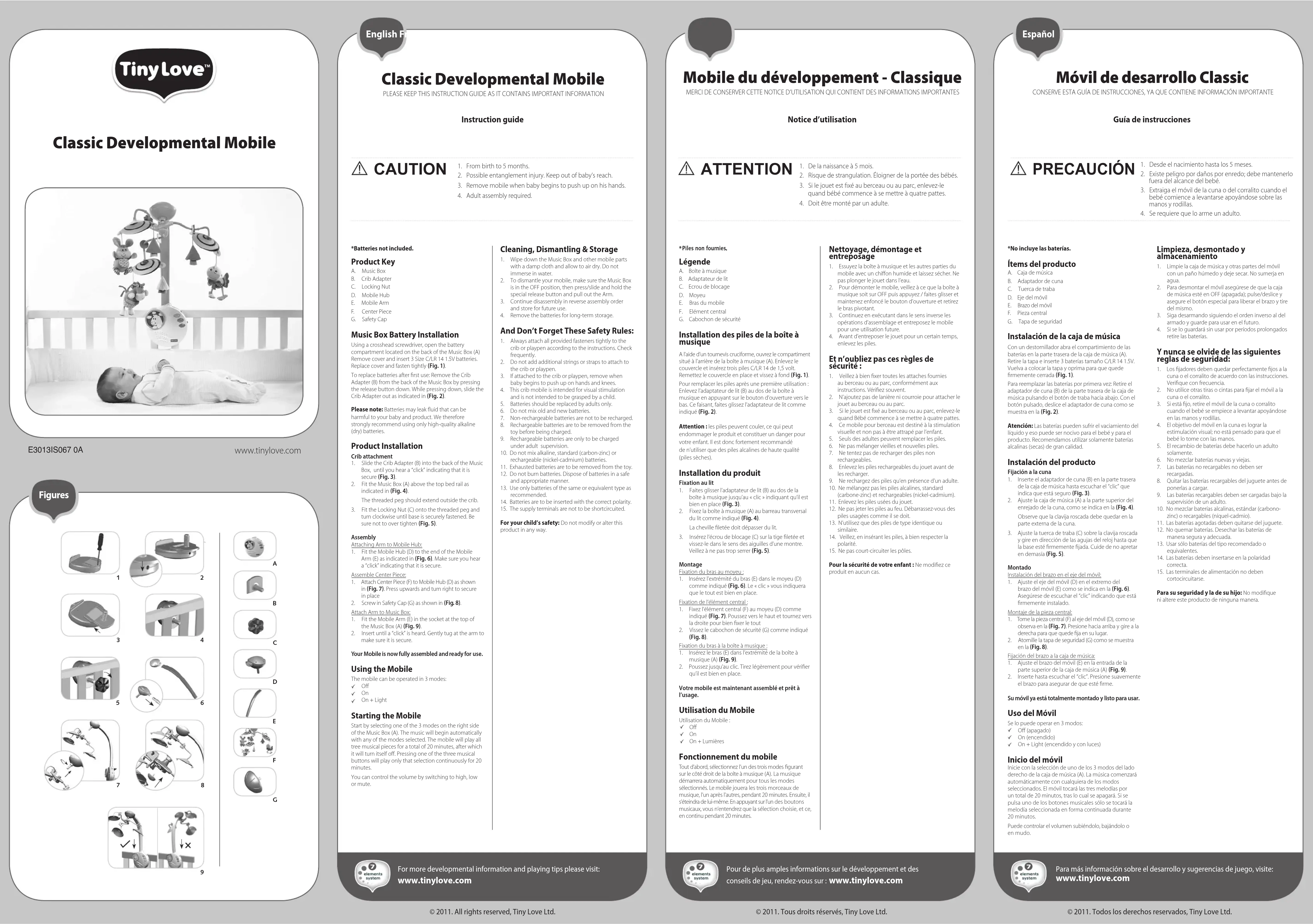Légende A. Boîte à musiqueB. Adaptateur de litC. Ecrou de blocage D. Moyeu E. Bras du mobile F. Elément centralG. Cabochon de sécurité Installation des piles de la boîte à musique A l’aide d’un tournevis cruciforme, ouvrez le compartiment situé à l’arrière de la boîte à musique (A). Enlevez le couvercle et insérez trois piles C/LR 14 de 1,5 volt. Remettez le couvercle en place et vissez à fond (Fig. 1).Pour remplacer les piles après une première utilisation : Enlevez l’adaptateur de lit (B) au dos de la boîte à musique en appuyant sur le bouton d’ouverture vers le bas. Ce faisant, faites glissez l’adaptateur de lit comme indiqué (Fig. 2).Attention : les piles peuvent couler, ce qui peut endommager le produit et constituer un danger pour votre enfant. Il est donc fortement recommandé de n’utiliser que des piles alcalines de haute qualité (piles sèches). Installation du produit Fixation au lit1. Faites glisser l’adaptateur de lit (B) au dos de la boîte à musique jusqu’au « clic » indiquant qu’il est bien en place (Fig. 3).2. Fixez la boîte à musique (A) au barreau transversal du lit comme indiqué (Fig. 4). La cheville letée doit dépasser du lit.3. Insérez l’écrou de blocage (C) sur la tige letée et vissez-le dans le sens des aiguilles d’une montre. Veillez à ne pas trop serrer (Fig. 5). MontageFixation du bras au moyeu :1. Insérez l’extrémité du bras (E) dans le moyeu (D) comme indiqué (Fig. 6). Le « clic » vous indiquera que le tout est bien en place.Fixation de l’élément central :1. Fixez l’élément central (F) au moyeu (D) comme indiqué (Fig. 7). Poussez vers le haut et tournez vers la droite pour bien xer le tout2. Vissez le cabochon de sécurité (G) comme indiqué (Fig. 8). Fixation du bras à la boîte à musique :1. Insérez le bras (E) dans l’extrémité de la boîte à musique (A) (Fig. 9).2. Poussez jusqu’au clic. Tirez légèrement pour vérier qu’il est bien en place.Votre mobile est maintenant assemblé et prêt à l’usage. Utilisation du Mobile Utilisation du Mobile : O On On + Lumières Fonctionnement du mobile Tout d’abord, sélectionnez l’un des trois modes gurant sur le côté droit de la boîte à musique (A). La musique démarrera automatiquement pour tous les modes sélectionnés. Le mobile jouera les trois morceaux de musique, l’un après l’autres, pendant 20 minutes. Ensuite, il s’éteindra de lui-même. En appuyant sur l’un des boutons musicaux, vous n’entendrez que la sélection choisie, et ce, en continu pendant 20 minutes. Español © 2011. Todos los derechos reservados, Tiny Love Ltd.Para más información sobre el desarrollo y sugerencias de juego, visite: www.tinylove.com Móvil de desarrollo Classic CONSERVE ESTA GUÍA DE INSTRUCCIONES, YA QUE CONTIENE INFORMACIÓN IMPORTANTE Guía de instrucciones PRECAUCIÓN *No incluye las baterías. Ítems del producto A. Caja de músicaB. Adaptador de cunaC. Tuerca de trabaD. Eje del móvilE. Brazo del móvilF. Pieza centralG. Tapa de seguridad Instalación de la caja de música Con un destornillador abra el compartimiento de las baterías en la parte trasera de la caja de música (A). Retire la tapa e inserte 3 baterías tamaño C/LR 14 1.5V. Vuelva a colocar la tapa y oprima para que quede rmemente cerrada (Fig. 1).Para reemplazar las baterías por primera vez: Retire el adaptador de cuna (B) de la parte trasera de la caja de música pulsando el botón de traba hacia abajo. Con el botón pulsado, deslice el adaptador de cuna como se muestra en la (Fig. 2).Atención: Las baterías pueden sufrir el vaciamiento del líquido y eso puede ser nocivo para el bebé y para el producto. Recomendamos utilizar solamente baterías alcalinas (secas) de gran calidad. Instalación del producto Fijación a la cuna1. Inserte el adaptador de cuna (B) en la parte trasera de la caja de música hasta escuchar el “clic” que indica que está seguro (Fig. 3).2. Ajuste la caja de música (A) a la parte superior del enrejado de la cuna, como se indica en la (Fig. 4). Observe que la clavija roscada debe quedar en la parte externa de la cuna.3. Ajuste la tuerca de traba (C) sobre la clavija roscada y gire en dirección de las agujas del reloj hasta que la base esté rmemente jada. Cuide de no apretar en demasía (Fig. 5). MontadoInstalación del brazo en el eje del móvil:1. Ajuste el eje del móvil (D) en el extremo del brazo del móvil (E) como se indica en la (Fig. 6). Asegúrese de escuchar el “clic” indicando que está rmemente instalado.Montaje de la pieza central: