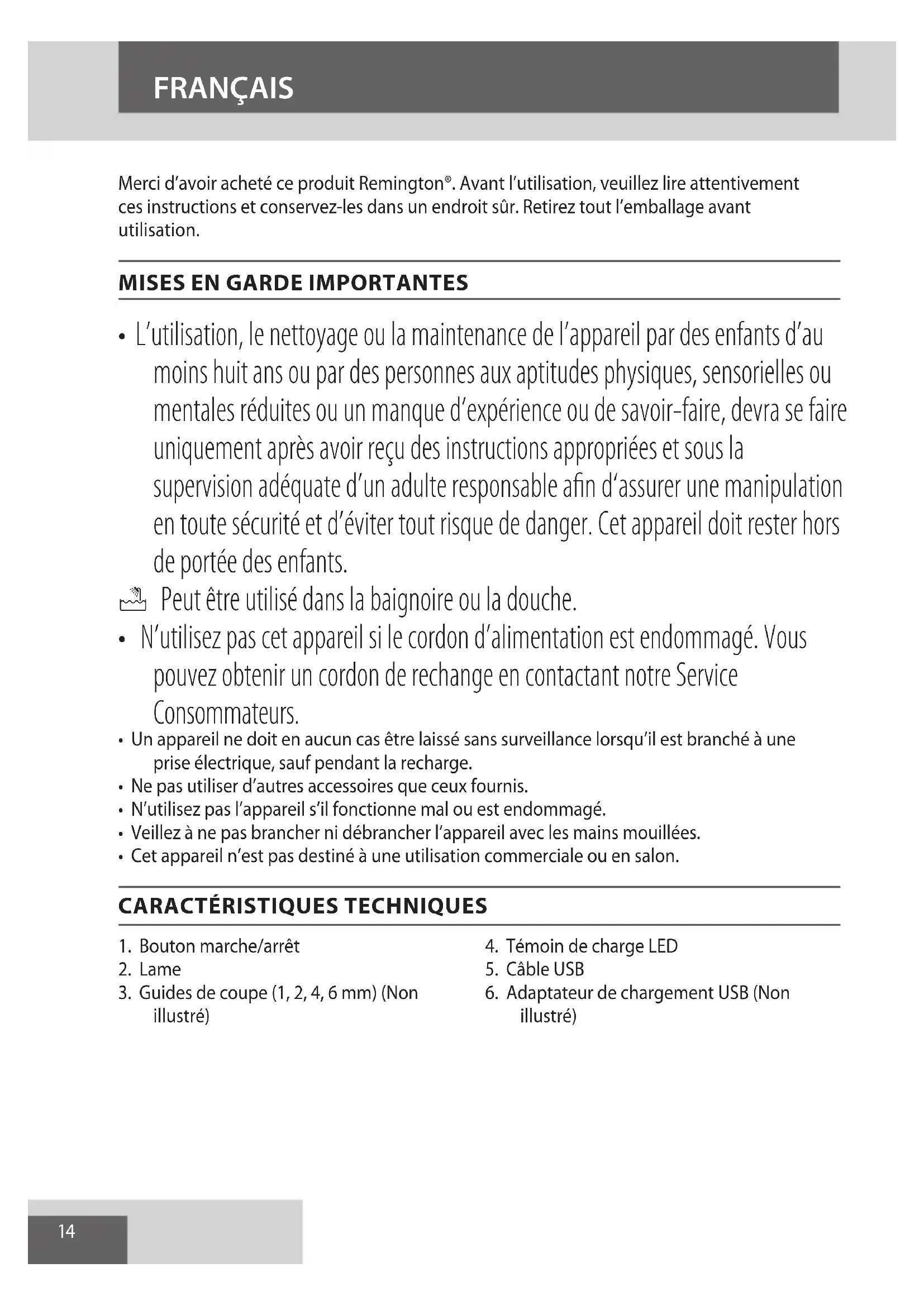 AE14 Merci d’avoir acheté ce produit Remington®. Avant l’utilisation, veuillez lire attentivement ces instructions et conservez-les dans un endroit sûr. Retirez tout l’emballage avant utilisation.