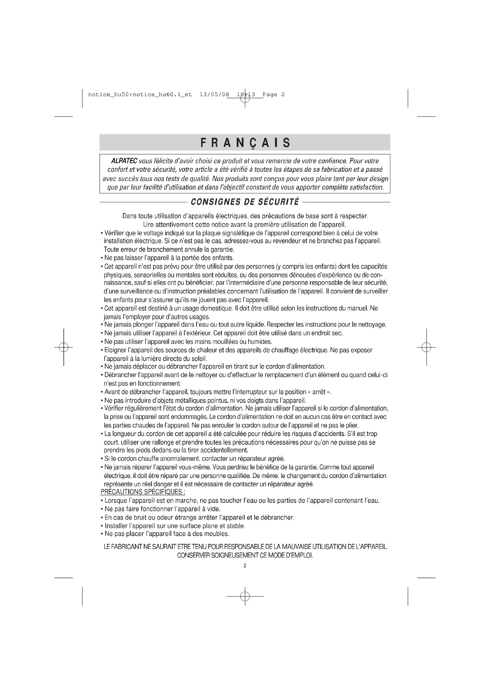 FRANÇAIS FRANÇAIS ALPATEC vous félicite d’avoir choisi ce produit et vous remercie de votre confiance. Pour votre confort et votre sécurité, votre article a été vérifié à toutes les étapes de sa fabrication et a passé avec succès tous nos tests de qualité. Nos produits sont conçus pour vous plaire tant par leur design que par leur facilité d’utilisation et dans l’objectif constant de vous apporter complète satisfaction. notice_hu50:notice_hu60.1_et 13/05/08 10:13 Page 2DESCRIPTION DE L’APPAREIL